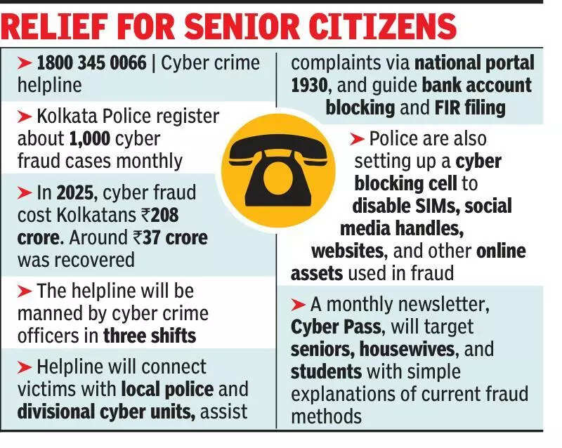 In addition, the police are also setting up a specialised cyber blocking cell that will block SIM cards, social media handles, websites, or anything available online that are reportedly used to carry out online frauds. Keeping in mind the needs of senior citizens who are vulnerable to high-value crimes, the police will also publish a monthly newsletter, named Cyber Pass, that will discuss the modus operandi in circulation among fraudsters. The language will be simple, targeting senior citizens, homemakers and students who form the most vulnerable groups.“Over the last few years, Kolkata saw a rise in cybercrimes. So we decided that, just like security on roads or at home is important, digital security is also the need of the hour. Hence, we will fight cybercrime 24×7. Cyber crooks are invisible, silent, and do not bother about geographical barriers. In cybercrime, the golden hour is important; time indeed is money. Our rapid response system will liaise with the victims and help them lodge a complaint at 1930. We will also liaise with banks and other organisations so that the response is quicker. In the last one year, we returned more than 25% of the lost money,” said commissioner Supratim Sarkar.According to DC (Cyber) Abhishek Modi, the announcements a day prior to Safer Internet Day on Feb 11 will target senior citizens, the most vulnerable of all citizens. According to Modi, the new helpline received more than 50 calls on the first day, several of which were duly resolved.