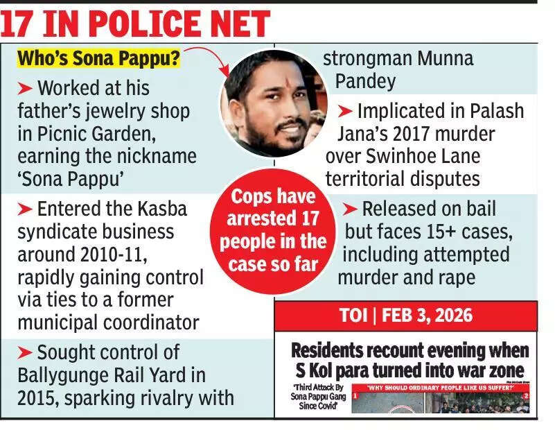 “We arrested seven more people overnight in connection with the incident, including prime suspect Babusona. The arrests were based on credible source information and CCTV footage analysis. The accused were taken into custody for further investigation. More arrests are likely,” said Joint CP Rupesh Kumar (crime & traffic). The last to be arrest was Chanchal Naskar alias Sonu, 20, a close aide of Pappu’s rival Bapi Halder.In the FB video, Pappu was seen inside a car. He began by stating that he did not like going live but felt compelled to do so, explaining that since Sunday, he was getting calls over the alleged trouble. Pappu claimed he was not at the scene on Sunday night, as he was observing a religious ceremony at home, which was captured on his home’s CCTV. He questioned how he could have been involved in the trouble if he was at home.Pappu, questioned about his photo with Babusona, responded by questioning the logic of guilt by association. He compared it to other instances where individuals were not held accountable for others’ actions, dragging the names of PM Narendra Modi and leader of opposition, Suvendu Adhikari. Furthermore, Pappu criticised Adhikari, who reportedly alleged that Pappu stopped his rallies, claiming that Adhikari’s party lacked presence in south Kolkata.Pappu also defended his own financial status, citing his family’s gold business, claiming he too was a businessman.