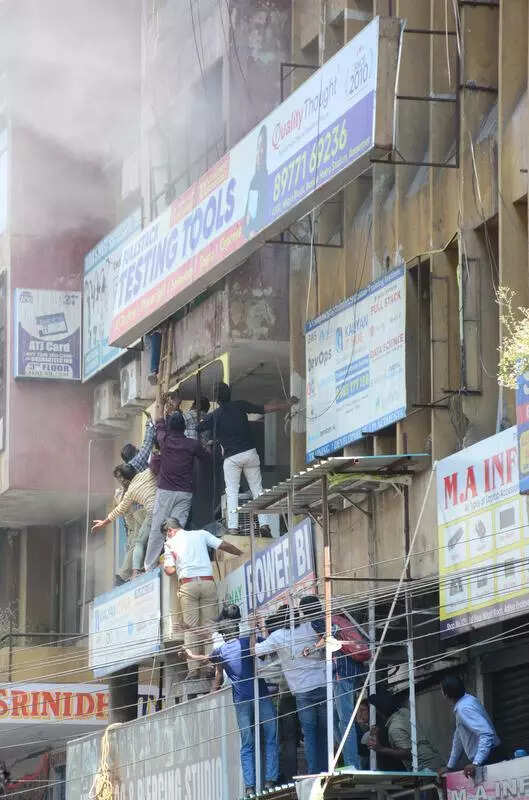 According to witnesses and fire officials, the fire started on the ground floor of the Neelagiri Complex in Aditya Enclave, in Maitrivanam, between 10.50 am and 11 am. Prima facie, they suspect it originated from an electrical shaft near the staircase and spread to other parts of the building.“More than the fire, it was smoke that filled the floors above, due to a complex web of electrical cables and flammable materials. Within minutes, it engulfed the building. Preliminary damage is estimated at about Rs 2 lakh to Rs 3 lakh,” said P Ramesh, station fire officer (SFO), Panjagutta.Recalling those moments of fear, B Prashanth, an IT course student, said that about 20 of them suddenly smelt burning plastic from billboards. “Soon, smoke started filling the rooms. Since the windows are blocked with billboards, there was no ventilation. Some of us panicked and moved towards the only exit. But our teachers kept asking us to stay calm,” he said, sharing how they heaved a sigh of relief only when fire personnel brought them down a ladder from the balcony.A local mobile shop owner stranded on the third floor also said how it was impossible to climb down the stairs because of the smoke. “For a moment, I honestly thought I’d be stuck for much longer,” he said, adding that fire engines arrived at the spot around 11:15 am.Eyewitnesses described complete chaos outside the building, with torn hoardings and partially burnt banners dangling precariously. To prevent the fire from spreading further, officials asked the building staff to cut the power supply.The building, about 35 years old, houses over 200 small and medium-sized establishments, including software teaching and skill development institutes, mobile repair shops, laptop servicing units, and printing and designing centres. Police asked nearby shops to remain closed for the rest of the day.Building lacks mandatory NOC certificatesWhile Friday’s fire was brought under control in less than an hour, T. Venkanna, District Fire Officer (DFO)-1, Hyderabad, said that the area is a sitting duck for such incidents, as most buildings — including the Neelagiri Complex — lack mandatory NOC certificates. There are narrow staircases and loose electrical wiring. “Worse, they either do not have extinguishers or their firefighting equipment is dysfunctional. They are not even designed for heavy commercial use,” he said. “We will inspect the complex on Saturday and file a report. Any illegal expansions or constructions will face action and penalties,” he added.Officials claimed that despite repeated awareness drives and drills, shop and building owners — old and new — fail to maintain basic safety measures and equipment.Swarming with coaching centres, locals admitted that the buildings — despite very high footfall — lack maintenance. “There are rodents that cut the cables. Hundreds of plastic banners are hanging everywhere, which increases the risk of fires. During incidents, fire tenders struggle to reach the narrow interiors,” said a local shopkeeper, Riyaz Samdani.Students too voiced similar concerns. “Our classroom is built to fit only four or five students. But at least 10 sit there at any time. With no ventilators and faulty wiring, short circuits are sure to happen,” said N. Jyothi Prakash, a regular at one of the centres.Second incident in two monthsIncidentally, Friday’s fire was the second such incident recorded in Maitrivanam in the last two months. In early December, a fire broke out in three computer repair shops in the Annapurna Complex — located close by — though no injuries were reported there as well.“HYDRAA DRF teams inspect buildings below 50 m regularly. For structures above 50 m, we conduct awareness programmes and mock drills—they must coordinate with us,” said A Sreedas, DFO-2, Hyderabad.“These consecutive incidents should be an eye-opener. We inspected some shops last month along with officials from the fire, GHMC, electricity, and police departments and seized them. Some buildings were given a month to implement fire safety measures. Everybody must take this seriously now,” said A V Ranganath, commissioner, HYDRAA.