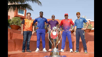 From left: Shane Watson, Carlos Brathwaite, Shikhar Dhawan, Harbhajan Singh and Naman…