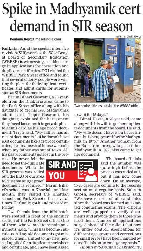 Kolkata: The West Bengal Board of Secondary Education (WBBSE) completed verification of 58,113 Madhyamik-related documents received from districts across the state as part of the SIR process, officials said on Saturday.According to board sources, the Park Street office received around 3,000 to 4,000 documents over the past 20 days since the verification process began. To handle the volume, the board set up 24 verification tables to check submitted papers against WBBSE records.A senior official said the board introduced a standard operating procedure to streamline the receipt and scrutiny of documents. “Documents such as admit cards, mark sheets and certificates were submitted for verification and checked against our records,” the official said. The board also reported receiving a small number of documents issued by other boards — around 500 to 600 — which were identified during scrutiny. The documents were later returned.The exercise took place amid confusion over which school-leaving documents would be accepted. Midway through the process, the EC announced that Madhyamik admit cards won’t be accepted, leading to a sudden drop in number of admit cards submitted for verification.Following a Supreme Court order in late Jan, EC started accepting admit cards again, and the number of such documents sent for verification rose in subsequent weeks. “For a few days, documents related to mark sheets and certificates only came for verification, but Madhyamik admit cards again started coming in the last two weeks,” the official said, adding that the board did not find anything abnormal so far.