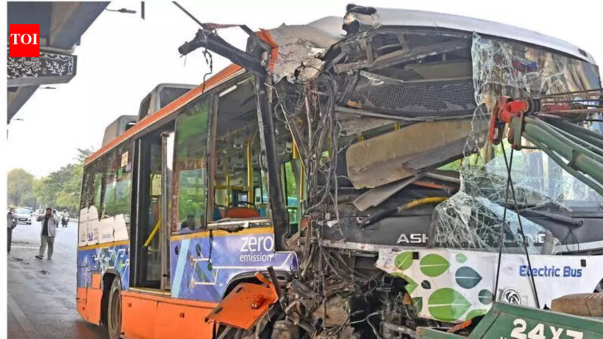 Ahmedabad: A BRTS bus rammed into a bridge pillar on SG Highway near Sola Civil Hospital early Thursday morning, leaving the driver trapped inside the mangled front portion of the vehicle. The driver was rescued after a nearly one-hour-long operation by the firefighters.The accident occurred around 6.30am when the bus, allegedly being driven at high speed, crashed into a pillar of the BRTS bridge. The impact crushed the front portion of the bus, pinning the driver between the accelerator and brake pedals.