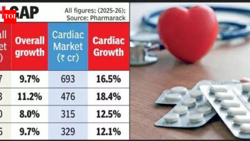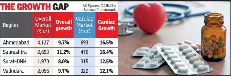 Across the entire Gujarat, cardiac drugs saw a 13% growth. Against this, the overall pharma market of the state grew at 8%.In fact, the trend is similar for the past 2 years as well, when CVD drug sales showed double-digit growth in the range of 10-18% in these key markets of Gujarat.Sedentary routines, rising stress, and the resultant spurt in diabetes and hypertension among young people were already noted. The trend cuts across regions. Ahmedabad accounts for the largest cardiac drug sales in absolute terms, while Saurashtra emerged as the fastest-growing hotspot. Surat, Dadra & Nagar Haveli, and Vadodara also indicate a steady double-digit growth in sales of cardiac drugs.Sheetal Sapale, vice-president (commercial), Pharmarack, said the sustained surge in cardiac drug sales indicates changing lifestyles. “Sedentary routines, poor eating habits, and a lack of exercise are major drivers [of the trend],” she said.Sheetal Sapale, vice-president (commercial), Pharmarack said, “Cardiovascular conditions are increasingly being diagnosed in younger age groups. Since these conditions are chronic and often lifelong, the growth of sales of drugs becomes sustained.Sapale said that while the use of medicines to treat high BP typically rises with age, more young people are now being put on higher-end cardiac medicines. “They are at the peak of professional and personal responsibility, which improves adherence and compliance.”Medical practitioners warn that rising cardiac drug consumption is a proxy indicator of growing cardiovascular vulnerability. Gujarat already reported an increasing prevalence of diabetes and hypertension in recent surveys.Dr Zeeshan Mansuri, an interventional cardiologist at Narayana Hospital, said that the growth is attributable to a significant increase in acute coronary syndrome diagnoses, especially among younger demographics.“This trend is further supported by heightened awareness within the middle-aged and younger populations regarding routine health screenings,” he said.Mansuri said, “The screenings are now identifying a greater number of cardiometabolic syndromes and cardiovascular diseases prior to the onset of acute coronary events or cerebrovascular accidents.”Dr Jay Shah, an interventional cardiologist with HCG Hospitals, said that more than 1-third of the medicines prescribed even by the GPs relate to lipids and hypertension and are preventive therapies. “Apart from the growing burden of cardiac issues, regular health check-ups and incidental findings often result in non-surgical interventions,” Shah said.