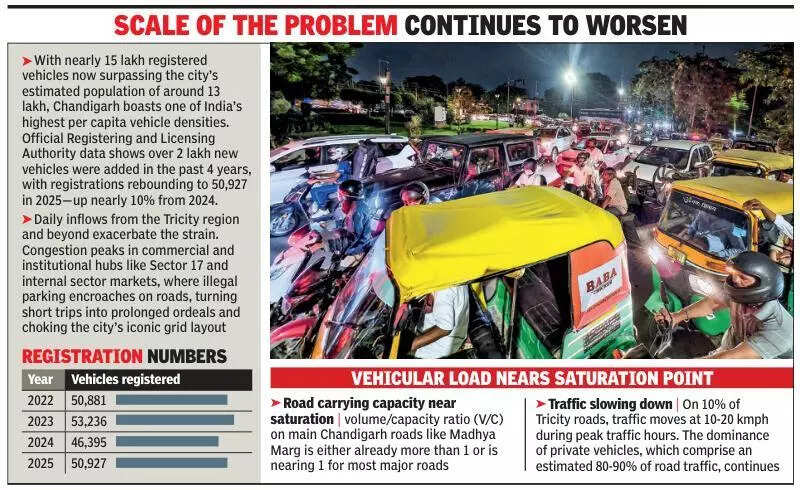 Chandigarh: Chandigarh’s traffic and parking crisis reached a critical point, threatening the city’s famed liveability, even as fresh national recommendations revived calls to examine solutions like congestion pricing—a measure long advocated in local policy but left unimplemented amid political and public resistance.The Economic Survey 2025-26, tabled in Parliament in late January 2026, explicitly urged Indian cities to adopt targeted congestion pricing in dense business districts alongside demand-based parking management. Such strategies, it noted, can slash traffic volumes, boost average speeds, and reduce emissions, drawing from proven international examples.The survey highlighted recent reforms like Chennai’s Metropolitan Area Parking Policy 2025, which disincentivises excessive private vehicle use by treating parking as scarce urban real estate, enforcing stricter rules, and prioritising walking, cycling, and public transport. These demand-management tools, it argued, serve as practical complements to major transit investments.In Chandigarh, similar ideas have languished on paper. The city’s parking policy recommends that the municipal corporation prioritise peak and non-peak hour congestion pricing across high-demand zones—including commercial, institutional, residential, and public/semi-public areas. It called for a technology-enabled parking management system to handle differential rates and congestion-based fees. The policy also pushed innovative concepts like car-free days and vehicle-free zones, none of which materialised.Some other parking solutions in Chandigarh parking policy yet to be implemented included plying of staff buses by all govt/PSU/organisations/industrial/IT companies; differential timings for schools/office among Punjab/Haryana/UT; on-street parking on payment basis; community parking for night in each sub sector; dedicated bus corridors.Failure to act on these short-term measures is especially stark given the paralysis of longer-term fixes. A proposed metro rail project remains stalled due to opposition within the UT administration and central govt, with implementation—if revived—likely years or even decades away.A 2023 attempt by the Chandigarh Municipal Corporation under then-Mayor Anup Gupta to double parking fees for vehicles registered outside the Tricity area (Chandigarh, Panchkula, and Mohali) aimed to deter external inflows but sparked backlash from Punjab and Haryana govts—both of which use Chandigarh as their capital. The UT Administrator ordered a rollback in August 2023, citing the policy as “biased.”INTERNATIONAL ROLE MODELSInternational role models demonstrate the potential. Singapore’s 1975 Area Licensing Scheme cut central business district car entries by about 45%, with the later Electronic Road Pricing system delivering further reductions on key routes.London’s cordon-based Congestion Charge reduced zone traffic by 16% (including 30% for cars), eased overall congestion by 32%, and boosted bus, cycle, motorcycle, and taxi usage.YET LOCAL VOICES EXPRESS SCEPTICISM.A senior UT official, speaking on condition of anonymity, acknowledged congestion pricing’s theoretical merits but deemed it impractical due to anticipated public and political opposition. Past efforts, including a pilot on-street parking scheme in Sector 35 and recent pushes for expanded paid parking, collapsed amid resistance from residents and elected representatives.Former Mayor Anup Gupta, who backed the 2023 out-of-Tricity fee hike, echoed doubts: “Congestion tax within the city is not practical. The supporting infrastructure—like adequate parking near central business districts such as Sector 17—is lacking. Similarly, the public transport system isn’t equipped to handle those willing to leave their vehicles behind.”BOX—FOR GRAPHICSTHE SCALE OF THE PROBLEM CONTINUES TO WORSEN.With nearly 15 lakh registered vehicles now surpassing the city’s estimated population of around 13 lakh, Chandigarh boasts one of India’s highest per capita vehicle densities. Official Registering and Licensing Authority data shows over 2 lakh new vehicles were added in the past 4 years, with registrations rebounding to 50,927 in 2025—up nearly 10% from 2024.Daily inflows from the Tricity region and beyond exacerbate the strain. Congestion peaks in commercial and institutional hubs like Sector 17 and internal sector markets, where illegal parking encroaches on roads, turning short trips into prolonged ordeals and choking the city’s iconic grid layout.Increasing registrations Year | vehicles registered 2022 | 50,881 2023 | 53,236 2024 | 46,395 2025 | 50,927 Road carrying capacity near saturation: volume/capacity ratio (V/C) on main Chandigarh roads like Madhya Marg is either already more than 1 or is nearing 1 for most major roads.Traffic slowing down: On 10% of Tricity roads, traffic moves at 10-20 kmph during peak traffic hours.The dominance of private vehicles, which comprise an estimated 80-90% of road traffic, continues.