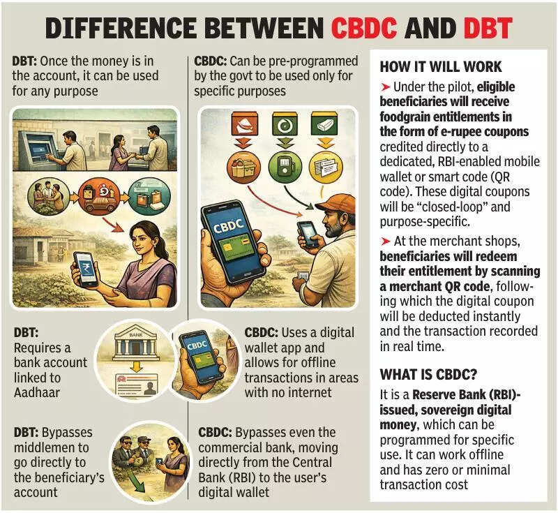 Chandigarh: Starting mid-February, Chandigarh will be one of only 3 locations in the country where the first large-scale use of the Reserve Bank of India‘s (RBI) central bank digital currency (CBDC), the e-rupee (e₹), will be used for subsidy distribution.The pilot project aims to integrate “programmable” digital currency into the Public Distribution System (PDS), including schemes such as the Pradhan Mantri Garib Kalyan Anna Yojana (PMGKAY), with the objective of improving efficiency, transparency, and last-mile delivery.Besides Chandigarh, the union govt is implementing the project in Puducherry and selective districts of Gujarat.Instead of cash transfer of food subsidy into the Aadhaar-linked bank account, the ministry is planning to transfer CBDC into the wallet or smart code to the beneficiaries, who can further redeem it at the merchant or retail shop to procure items as mandated under the NFSA. Banks, through their CBDC platform, will enrol both the beneficiaries as well as the merchant.“The proof-of-concept project will be implemented on a limited scale to test technical robustness before any nationwide expansion. Areas with relatively high digital literacy and existing PDS automation have been selected for the trial. Besides Chandigarh, Puducherry and selective districts of Gujarat will be covered in the pilot stage,” said a senior UT official.A number of meetings were held between the UT and central govt officials in this regard, and the pilot project will start from mid-February.How it will workUnder the pilot, eligible beneficiaries will receive foodgrain entitlements in the form of e-rupee coupons credited directly to a dedicated, RBI-enabled mobile wallet or smart code (QR code). These digital coupons will be “closed-loop” and purpose-specific.At the merchant shops, beneficiaries will redeem their entitlement by scanning a merchant QR code, following which the digital coupon will be deducted instantly and the transaction recorded in real time.The e-rupee issued under the scheme cannot be withdrawn as cash or used for non-essential purchases. The system is designed to create a digital audit trail, enabling authorities to track when and where foodgrains are distributed.“The issued digital money will have time-bound validity. By putting a restriction on the time, ineligible or dummy beneficiaries can be identified. If there is a long delay in the issuance and use of digital money, it could indicate the beneficiary may not be eligible for the govt subsidy,” said the official.The new digital currency will also allow for geo-fencing. So, if the beneficiary is registered in Chandigarh, it will be known whether he is availing the subsidy in Chandigarh or outside.“It will ensure that money is only used for foodgrains as mandated under the NFSA, and not for any other purposes. There were instances when beneficiaries used the DBT for other uses, even for purchasing liquor. This will curb such practices,” said the official.DIFFERENCE BETWEEN CBDC PDS AND DBTDBT | CBDC Once the money is in the account, it can be used for any purpose | Can be pre-programmed by the govt to be used only for specific purposes Requires a bank account linked to Aadhaar | Uses a digital wallet app and allows for offline transactions in areas with no internet Bypasses middlemen to go directly to the beneficiary’s account | Bypasses even the commercial bank, moving directly from the Central Bank (RBI) to the user’s digital walletWHAT IS CBDC?It is a Reserve Bank (RBI)-issued, sovereign digital money, which can be programmed for specific use. It can work offline and has zero or minimal transaction cost. e-Rs or digital rupee. MSID:: 127888200 413 |