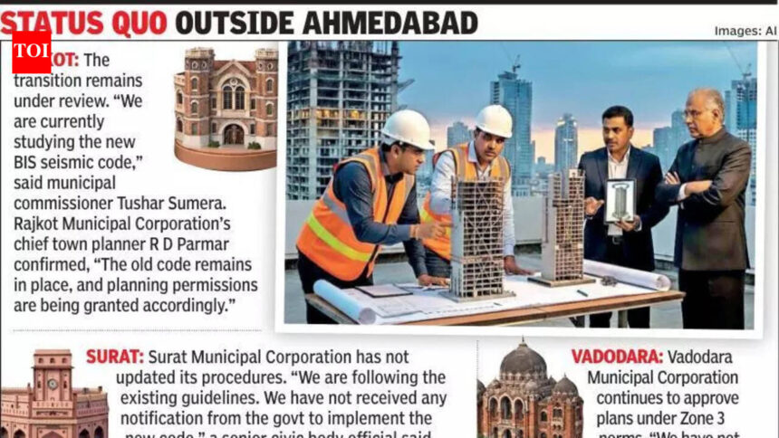 Ahmedabad/Surat/Vadodara/Rajkot: The implementation of the new seismic building code has divided Gujarat’s major municipal corporations, which could result in a policy deadlock over construction norms in the state’s biggest cities.The Bureau of Indian Standards’ (BIS) revised structural code — IS 1893:2025 — has officially upgraded Ahmedabad, Surat, Vadodara and Rajkot from Seismic Zone 3 (moderate risk) to Zone 4 (high risk), mandating stricter earthquake-resistant design standards. However, civic bodies have adopted differing approaches to its enforcement.The Ahmedabad Municipal Corporation (AMC) has taken a firm stand, issuing a circular mandating immediate compliance with the new code for all building plans submitted after Nov 3, 2025. On Jan 19, AMC further directed structural engineers to submit affidavits confirming adherence to the new structural code. The move has reportedly stalled around 15 major high-rise projects in the city.In contrast, municipal corporations in Surat, Vadodara and Rajkot continue to approve projects under the 2016 version of the code (IS 1893:2016), citing a six-month transition window granted by the Centre that keeps the earlier standards valid until May 3, 2026. These civic bodies have also sought clarifications from the state govt on the issue.Developers in Ahmedabad have urged AMC to permit use of the old code until the transition deadline, citing financial and technical complications. The Zone 4 classification requires buildings to withstand higher seismic forces and incorporate mandatory ‘ductile detailing’ to ensure structures bend rather than collapse during earthquakes.“AMC’s insistence on exclusive adherence to the new code from Nov 3, 2025 is inconsistent with the Centre’s transition provision,” said Rajesh Vaswani, chairman, Credai Ahmedabad. He added that around 15 project plans, including buildings taller than 45 metres, are currently stalled.Builders argue that projects in advanced planning stages cannot easily switch standards. According to Credai, “Constructing half a building under the old code and the rest under the new code is technically unfeasible.”Tejas Joshi, president, Credai Gujarat, said AMC should hold discussions with structural engineers before enforcing the new norms. “Credai is ready to work with AMC and engineers to create awareness among builders and stakeholders,” he said.(With inputs from Parag Dave in Ahmedabad, Nimesh Khalhariya in Rajkot, Sachin Sharma in Vadodara, Yagnesh Mehta and Vishal Patadiya in Surat)BOX: STATUS QUO OUTSIDE A’BADRAJKOTIn Rajkot, the transition remains under review. “We are currently studying the new BIS seismic code,” said municipal commissioner Tushar Sumera. Rajkot Municipal Corporation (RMC) chief town planner R D Parmar confirmed, “The old code remains in place, and planning permissions are being granted accordingly.”VADODARAThe Vadodara Municipal Corporation continues to approve building plans under Zone 3 norms. “We have not received any intimation regarding the implementation of the zone change,” an official said, adding that the city will “act as per directions” once guidance is received from the state govt.SURATThe Surat Municipal Corporation has not updated its procedures. “We are following the existing guidelines. We have not received any notification from the government to begin implementation under the new code,” a senior civic body official said. Meanwhile, Credai Surat chairman Rajiv Patel, in a letter to the chief minister, warned that the mandate would require “significant compliance measures,” including complex analysis and mandatory ductile detailing, sharply increasing construction costs for both developers and residents.