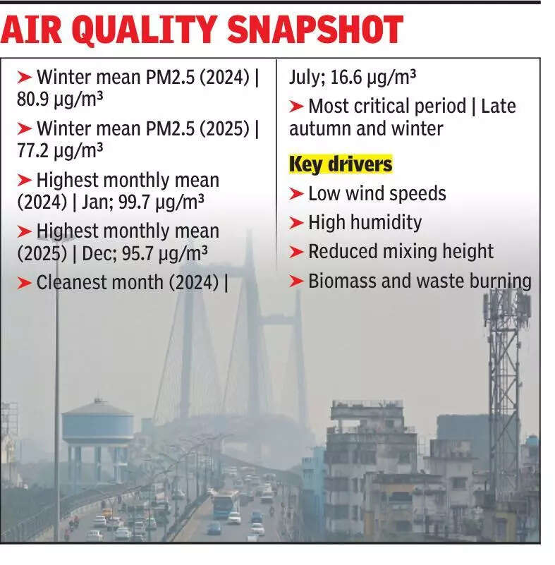 Kolkata: The city’s winter air turned toxic as a Climate Trends study flagged meteorology and climate change as key pollution drivers. Even as Delhi and Patna grab headlines for choking smog, a new multi-city analysis by environmental think tank Climate Trends shows that Kolkata’s air pollution story is more complex and increasingly worrying.According to Climate Trends director Aarti Khosla: “The data is clear — on a stagnant day, even if emissions are controlled, pollution will remain high. Our clean air policy needs to stop treating every day as the same. Integrating weather into NCAP is not just a scientific necessity; it is the only path to creating realistic, effective, and sustainable air quality improvements for Indian citizens.” “The study examines how short-term weather patterns and long-term climate change influence air pollution levels across India,” she added. The study finds that atmospheric stagnation — low wind speeds, high humidity, and reduced mixing heights — is the dominant amplifier of pollution severity across Indian cities. In Kolkata, weak ventilation during winter prevents dispersion, allowing pollutants from biomass and waste burning to accumulate near surface. The report argues that pollution control strategies must integrate dispersion modelling with emissions inventories, rather than focusing solely on annual emission reductions.The study finds that while Kolkata’s PM2.5 levels are not as extreme as that in Delhi or Patna, the city experiences moderate to high pollution in winter, marked by prolonged stagnant conditions that trap pollutants close to the ground.It finds that compared to Bengaluru and Chennai, Kolkata shows stronger seasonal contrasts. Compared to Delhi and Patna, it records lower peaks but similar meteorological vulnerability during winter stagnation.During winter, the city’s air quality persistently remains in danger zone. Data from 2024 and 2025 reveal a sharp seasonal contrast — winter (Dec-Feb) 2024: 80.9 µg/m³; winter (Dec-Feb) 2025: 77.2 µg/m³. Although winter averages dipped slightly in 2025, monthly peaks remained alarming. Jan 2024 recorded 99.7 µg/m³, while Dec 2025 surged to 95.7 µg/m³.In contrast, monsoon provides dramatic relief. PM2.5 levels dropped to 20.3 µg/m³ (2024) and 21.7 µg/m³ (2025) during the rainy season.Atmospheric scientist Abhijit Chatterjee of Bose Institute said biomass and waste burning remain major contributors. “Local and regional sources play a vital role in winter-time pollution in Kolkata.” Dr Abhinandan Ghosh, air pollution expert, cautioned against blindly replicating Western benchmarks. “In Kolkata, it is not emissions alone but the tyranny of winter boundary-layer dynamics that engender the most deleterious pollution episodes.