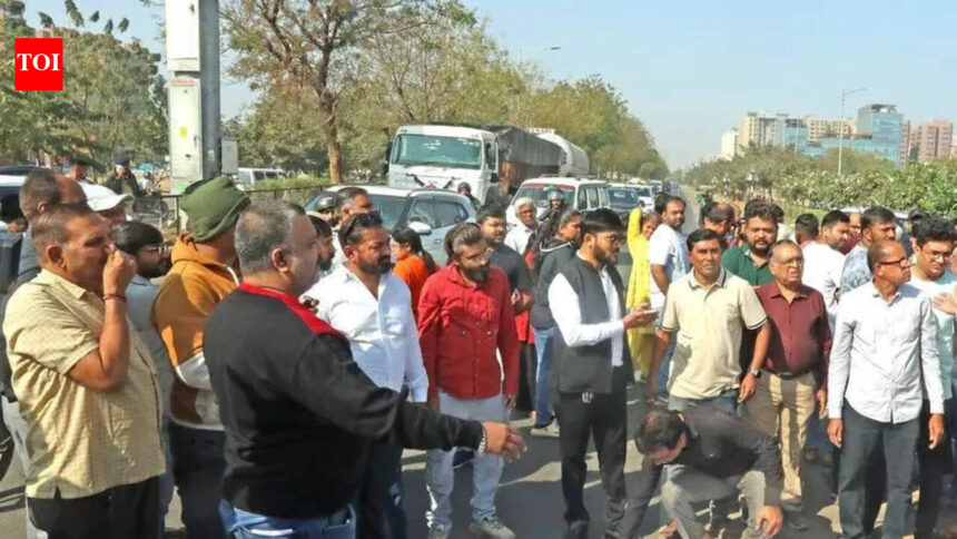 Ahmedabad: The closing of a gap in median near Hotel Hillock on Sardar Patel Ring Road triggered fresh protests on Sunday, with locals and commuters taking to the streets and clashing briefly with police. They alleged that the move has worsened traffic woes. Authorities had recently barricaded the gap in the divider at the intersection near Hotel Hillock on the stretch from Vaishnodevi Circle to Zundal Road. This forced commuters from areas such as New Tragad and Chandkheda to take a detour of nearly 4km. Locals said the closure has added to daily commute time and is causing traffic snarls. Tensions escalated on Sunday morning when protesters demanding that removal of the barricade blocked the SP Ring Road near Hotel Hillock, leading to a traffic jam stretching over half a kilometre. Vehicles heading from Vaishnodevi Circle towards Zundal remained stuck for hours. A police inspector and five deputies from Chandkheda police station rushed to the spot and attempted to disperse the crowd. The cops urged protesters to submit their representations through official channels and clear the road to avoid inconvenience to other commuters. This led to heated arguments and a brief confrontation between locals and police.Citizens then initiated a signature campaign demanding that the gap be reopened, alleging that repeated representations to elected representatives have failed to yield results.They said the gap was barricaded after a co-ordination meeting in which BJP Rajya Sabha MP Narhari Amin raised concerns over traffic congestion at the spot. “If a building a circle at the spot was permitted, it means there was to be a gap in the median anyway. Closing it now makes no sense,” said a woman during the protest.With the gap closed, motorists are using the culvert some 850m from Hotel Hillock to avoid the longer detour. Only one car and a two-wheeler can pass through the narrow culvert at a time, leading to frequent snarls. Locals alleged that despite the daily chaos, traffic cops are rarely seen regulating movement. Members of the Aam Aadmi Party, including ward-level office-bearers from Chandkheda, Sabarmati and Chandlodia, joined the protest.“Our only demand is that the cut be reopened immediately,” a protester said. Police said the situation was brought under control after negotiations, but warned against blocking public roads.