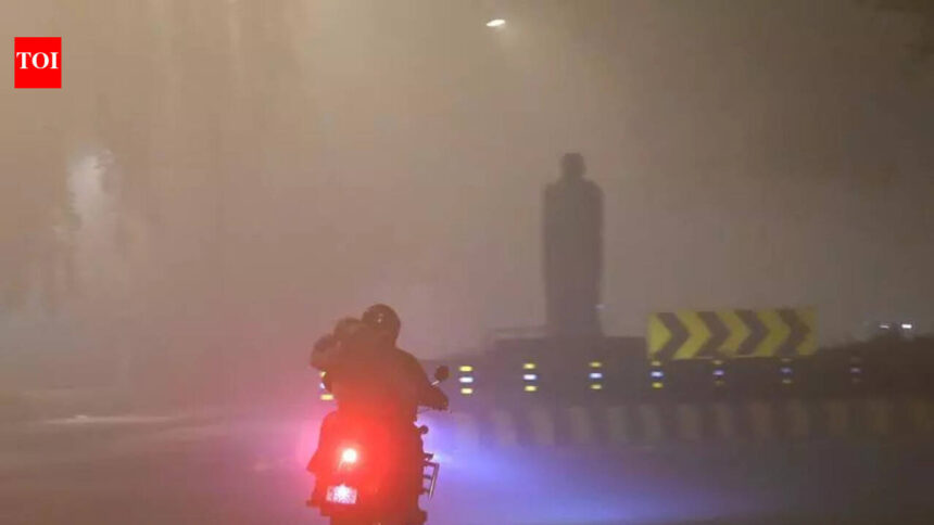 On Monday, the city saw dense fog for around six hours, with over 300 flights delayed. No flights were cancelled or diverted. “Safdarjung reported the lowest visibility of 100 m in dense fog from 03:30am to 04:30am and 07:30 to 08:30am, and Palam reported the lowest visibility of 100 m from 2 to 04:30am and 8 to 08:30am,” stated IMD.At the base station Safdarjung, the maximum temperature was recorded at 17.5 degree Celsius, 5 notches below normal, compared to 24.6 degree Celsius a day earlier. The minimum temperature was recorded at 10.4 degree Celsius, 2 notches above normal, against 12.1 degree Celsius a day earlier.The maximum and minimum temperature on Tuesday is expected to hover around 19–21 degree Celsius and 7–9 degree Celsius, respectively.As per IITM’s early warning system, the daytime temperature will remain below normal on Tuesday as well.Cold north-westerly winds are blowing again, with the AQI dipping to moderate for a few hours before deteriorating to poor again.The air quality index (AQI), on a scale of 0 to 400, at 4 pm was 210, against 265 a day earlier — both poor.