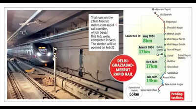 Ghaziabad: Prime Minister Narendra Modi will inaugurate the Meerut South-Modipuram section of the Delhi-Meerut rapid rail corridor on Feb 22, chief minister Yogi Adityanath said on Thursday after reviewing preparations for the event at the Hindon civil terminal.The new stretch will complete the Meerut arm of the Delhi-Meerut Namo Bharat corridor. At present, trains operate on 55km of the 82km corridor, between New Ashok Nagar in east Delhi and Meerut South. The trains will now run between New Ashok Nagar and Modipuram since Sarai Kale Khan is yet to be opened. Once the full route becomes operational, trains are expected to cover the distance from Sarai Kale Khan in Delhi to Modipuram in Meerut in about 55 minutes.The 23-km Meerut South–Modipuram section passes through densely populated parts of the city, including Begumpul, MES and Partapur. Trial runs on this stretch began in Feb last year and were completed by June. However, delays in opening the section had drawn criticism from commuters, particularly residents of central Meerut, who said they were forced to rely on costly last-mile transport to access the rapid rail corridor from Meerut South.“Every morning I take a shared auto to Meerut South, which takes 35 to 40 minutes,” said Asim, a resident near the Begumpul station. “Once the services start, I can simply walk to the station and save almost an hour to travel to Delhi.”The rapid rail corridor has been opened in phases. The first section, between Sahibabad and the Duhai Depot, was inaugurated in Oct 2023. This was followed by the opening of the Duhai–Modinagar North stretch in March 2024, Modinagar North–Meerut South in Aug 2024, and the Sahibabad–New Ashok Nagar section in Jan this year.Chairing a review meeting with divisional-level officials, Adityanath directed departments to complete all preparations for the inauguration within the stipulated timeframe. “The opening of this section will not only strengthen the regional transportation system but will also play a significant role in the overall development of Meerut and the surrounding districts,” the CM said.He issued instructions to ensure tight security arrangements, streamlined traffic management, sanitation, and adequate public facilities at the venue. Emphasis was also laid on seamless coordination among administrative, police and civic agencies to avoid any last-minute lapses.Earlier in the day, Adityanath reviewed the law and order situation and the progress of key development projects in Noida at a high-level meeting with senior district and police officials in Sector 38. The CM assessed policing arrangements, crime control measures and inter-departmental coordination, directing officials to maintain strict vigilance to ensure public safety in the rapidly urbanising and industrialising district. He stressed the need for a robust law and order framework to support growth and investor confidence.Adityanath also emphasised time-bound execution of development works, instructing authorities to closely monitor projects, remove bottlenecks swiftly and ensure transparency in implementation. He called for prompt redressal of public grievances and greater administrative accountability.