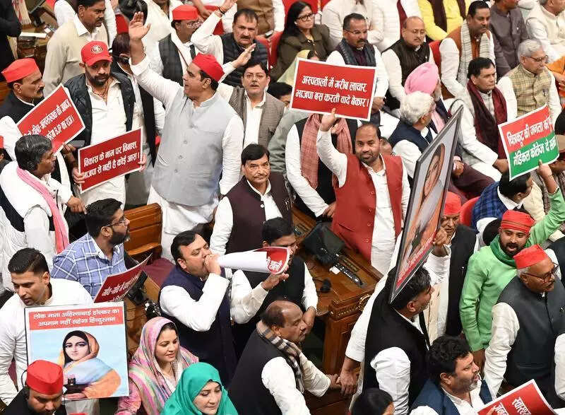 Lucknow: The governor’s address to the joint sitting of the UP Assembly on Monday was mired by din and pandemonium as Samajwadi Party members protested over bulldozer action as part of redevelopment work at Manikarnika Ghat in Varanasi and special intensive revision (SIR) of voters’ list by the Election Commission, among other issues.The SP members carried placards and posters and wore T-shirts bearing pictures of Manikarnika ghat’s demolition to register protest. They also trooped to the well of the House right in front of the Speaker’s podium and indulged in sloganeering.