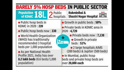 Kalyan: Work on Kalyan Dombivli Municipal Corporation’s 150-bed cancer hospital will soon commence in Dombivli, even as a 500-bed corporate hospital will open on Saturday. The Kalyan-Dombivli belt is clearly witnessing a post-Covid boom in healthcare, with a 50% increase in hospital beds since 2020.From 4,720 beds before Covid, the bed strength jumped to 7,138 in Jan, said a civic public health official. Roughly 1,000 are intensive care beds. However, as social activists pointed out, most of these beds for the 1.8 million population are in the private sector.In 2020, KDMC’s two key hospitals — Shastrinagar Hospital in Dombivli and Rukminibai Hospital in Kalyan — had 220 beds. Even after the launch of a maternity hospital at Vasant Valley, the beds in KDMC-run facilities increased only to 330. In other words, barely 5% of the beds are in the affordable public sector.Umesh Borgaonkar, group leader, Shiv Sena (UBT) in KDMC, criticised the civic body’s healthcare services. “KDMC may be implementing Smart City projects, but its healthcare system is in poor state. The civic hospitals don’t have ICU beds. Apart from basic fever treatment, dressings and maternity services, serious treatment facilities are lacking,” he said.Critical patients are routinely referred to Mumbai or Thane govt hospitals, he added. In fact, the flow of patients from KDMC prompted Thane’s Jupiter Hospital group to set up a 500-bed multispecialty hospital in Dombivli. Residents of KDMC, Ulhasnagar, Ambernath and Badlapur lived with inadequate healthcare for long. “In large Indian cities, no one should have to travel more than 45 minutes to get access to high-quality healthcare,” said Dr Ajay Thakker of Jupiter Hospital. Vinod Mishra, a resident of Kalyan East, said many multi-speciality hospitals in the KDMC region exist “only in name”. “Except for 2 or 3 hospitals, it was difficult to find facilities offering comprehensive treatment under one roof,” he said.The presence of hospital chains could bring pricing discipline among private healthcare providers here who charge high bills without offering facilities, he added. KDMC health officer Dr Deepa Shukla said the civic body operates three hospitals and two outsourced hospitals. In addition, KDMC runs 26 primary health centres, 50 wellness centres and 59 Hindu Hriday Samrat Balasaheb Thackeray Clinics. Efforts are underway to strengthen critical care services, said Dr Shukla. She said KDMC also plans to construct a 100-bed multi-speciality hospital at Gauripada in Kalyan. “But the project was delayed due to the absence of a consultant,” she added.Additional reporting by Malathy Iyer