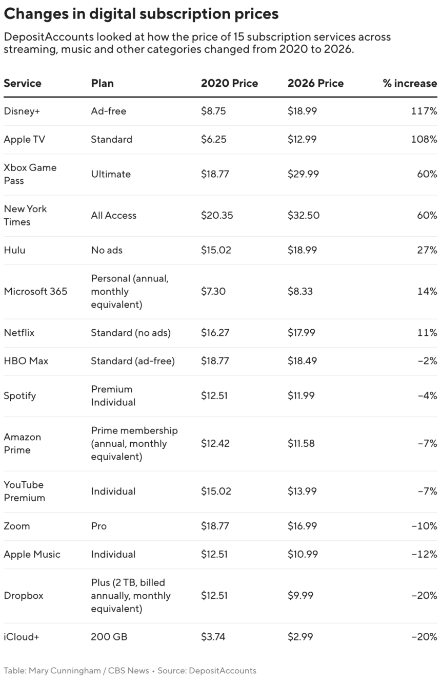 So concludes a recent analysis from DepositAccounts, an online platform owned by LendingTree that allows users to compare bank accounts. Researchers looked at 15 widely used subscription services, ranging from streaming platforms like Hulu and Spotify to online video tool Zoom Pro, to assess how their prices have changed over the last six years.