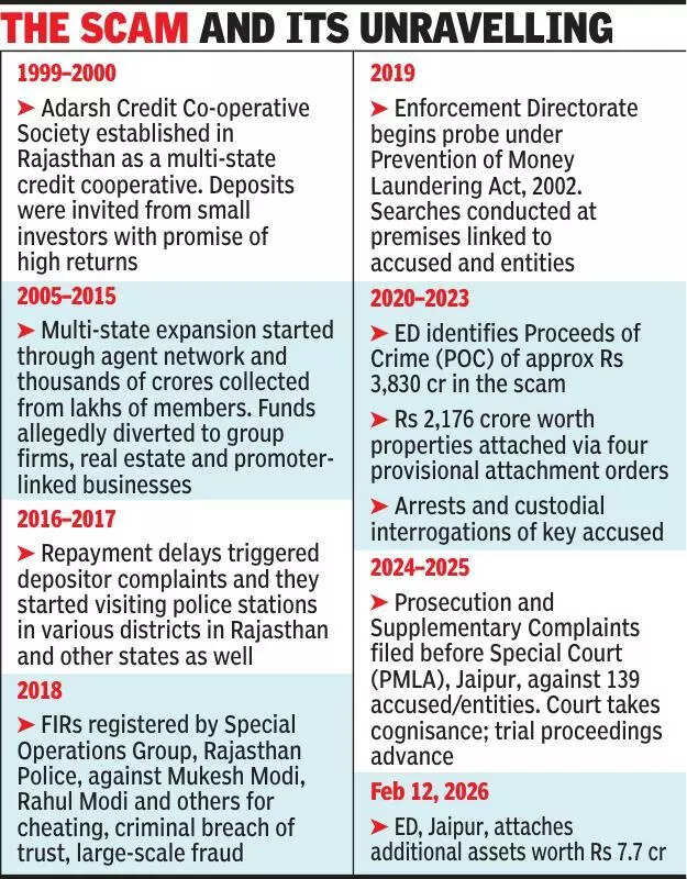 Jaipur: The Directorate of Enforcement (ED) Tuesday provisionally attached movable and immovable properties valued at over Rs 7.7 crore in Bhiwadi under the Prevention of Money Laundering Act (PMLA), 2002, linked to the alleged multi-crore fraud involving Adarsh Credit Co-operative Society Ltd and its associates.Officials from the ED confirmed that the attachment order was issued on Feb 12, as part of an ongoing investigation stemming from FIRs filed by the Special Operation Group (SOG) of the Rajasthan Police.