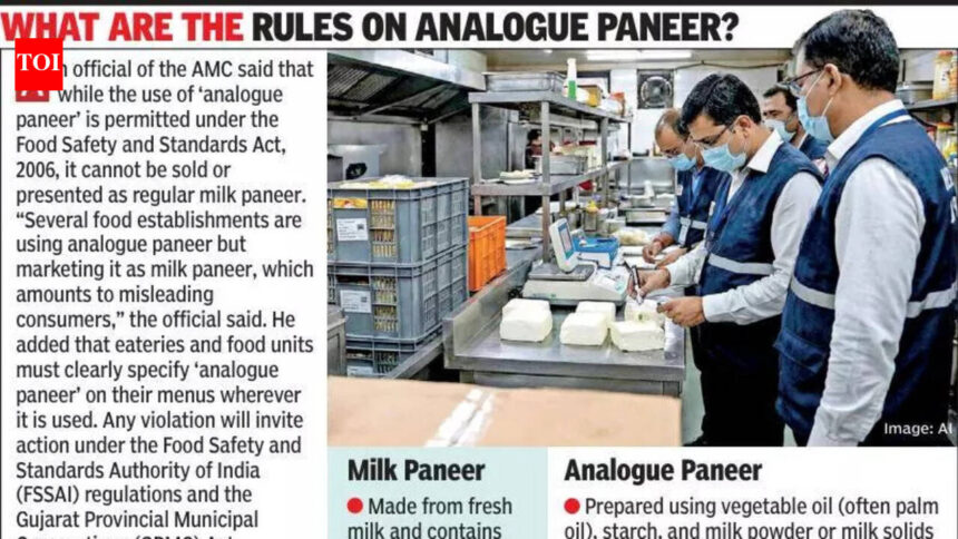 Between Feb 1 and 22, AMC’s food department carried out an extensive inspection drive across the city. During this period, 1,083 restaurants, hotels and food establishments were inspected and notices were issued to 432 units. Authorities also destroyed 823 kg of inedible food and 878 litres of inedible liquid. A total of 495 food samples were collected for testing, including 110 samples of dairy products such as paneer. Of these, 10 paneer samples from 10 different restaurants and food units were found to substandard after laboratory tests revealed the high content of vegetable fat.The establishments whose paneer samples failed quality standards include Barbeque Nation in Nikol, Jay Kalyan Fast Food in Thakkarbapanagar, The Leo Pizza in Bapunagar, Krishna Aloo Paratha Centre in Navrangpura, Jay Bhavani Bhojanalay in Vejalpur, Maa Ki Rasoi in Satellite, Nutrilicious in Jodhpur, Ubot Hospitality Pvt Ltd in Naranpura, The Real Paprika on Anandnagar Road and Pizzart in the Amraiwadi. These units were fined between Rs 7,000 and Rs 10,000.Following the findings, AMC officials traced the supply chain of the paneer and conducted raids at three locations. A total of 173kg of paneer was seized, including 14kg from a dairy unit on Sola Road, 110 kg from a dairy in Vejalpur and 49kg from a dairy in Naroda.The civic body has warned that inspections will continue in the coming days. The food department plans to check a wide range of items including cold drinks, snacks, ice cream, lassi, dry fruits, dairy products, bakery products, edible oils, prepared foods and raw materials. Hotels and restaurants operating without licence or registration will also face strict action.(GFX sent to designers)Box: What are the rules on analog paneer?An official of the AMC said that while the use of ‘analog paneer’ is permitted under the Food Safety and Standards Act, 2006, it cannot be sold or presented as regular milk paneer. “Several food establishments are using analog paneer but marketing it as milk paneer, which amounts to misleading consumers,” the official said. He added that eateries and food units must clearly specify ‘analog paneer’ on their menus wherever it is used. Any violation will invite action under the Food Safety and Standards Authority of India (FSSAI) regulations and the Gujarat Provincial Municipal Corporations (GPMC) Act.What’s the difference Milk Paneer Made from fresh milk and contains natural milk fat Rich in protein and offers higher nutritional value More expensive due to its pure milk content Analogue Paneer Prepared using vegetable oil (often palm oil), starch, and milk powder or milk solids Contains vegetable fat instead of natural milk fat Lower in protein and nutritional value compared to milk paneer Cheaper because it uses oil and starch as substitutes How to differentiate? Texture: Milk paneer is soft, slightly crumbly, and may release some moisture. Analogue paneer is rubbery and tends to regain shape after pressing Cooking: Milk Paneer softens but does not turn rubbery or excessively hard. But analogue paneer feels greasy and may become rubbery when cooked