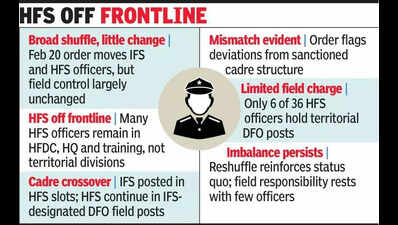 Gurgaon: The Haryana govt’s latest transfer and posting order has reshuffled Indian Forest Service (IFS) and Haryana Forest Service (HFS) officers across forest divisions, training institutes, wildlife wings, headquarters, and Haryana Forest Development Corporation (HFDC).On the ground, however, control of key forest divisions remains largely unchanged. Most frontline forest administration continues to be handled through the same arrangements that existed before the reshuffle. A large number of HFS officers remain in non-field or supervisory roles, even though their primary mandate is territorial forest management. Several officers continue in HFDC, headquarters-linked assignments, training or research posts, or against vacant and interim positions.A closer reading of the Feb 20 order by ACS forest Sudhir Rajpal shows a persistent mismatch between sanctioned cadre posts and actual postings. Several IFS officers are placed in positions officially classified as HFS cadre posts. These include DFO (seed collection), Pinjore, GM HFDC, Kurukshetra, DCF Rewari, deputy conservator of forests (DCF) (training) at Sohna and Pinjore. The order itself annotates these posts as belonging to the state service cadre, yet IFS officers man them. As a result, all-India service officers remain concentrated in monitoring, training, and specialised roles rather than senior territorial field positions.At the same time, the reverse arrangement continues in frontline divisions.HFS officers are posted as divisional forest officers (DFOs) in territorial divisions designated as IFS cadre posts. These include Pinjore, Yamunanagar, and Nuh. The analysis of the order flagged these as senior IFS field postings, but HFS officers continue to hold them after relieving IFS officers.The order also clarifies that DFO (HQ) is an HFS cadre post, despite being a supervisory assignment, pointing to how cadre officers and posts are freely interchanged rather than aligned.The reshuffle plays out against a larger staffing issue flagged by the IFS Officers’ Association, which TOI has reported about. Haryana has 16 sanctioned DCF posts, the senior-most field positions meant to be held strictly by IFS officers. At present, only nine of these posts are occupied by cadre officers, with the remaining divisions run by HFS officers, despite trained IFS officers being available and awaiting posting.In a representation to the chief secretary on Feb 19, the IFS Officers’ Association said the arrangement violates the IFS (Cadre) Rules, 1966, which require sanctioned IFS posts to be filled by cadre officers. Non-cadre appointments are allowed only in exceptional or temporary situations and require central govt approval if they continue beyond three months. The association said no such approval was obtained.