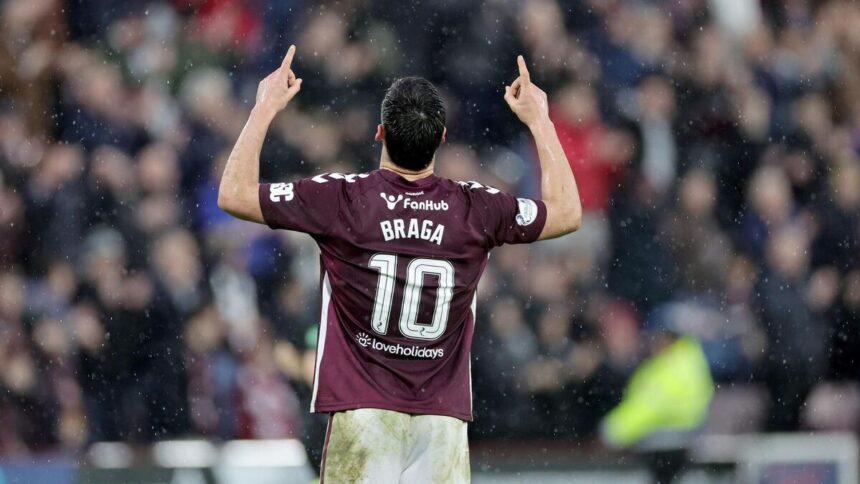 The Jambos almost doubled their lead seconds after the interval when Braga drilled agonisingly wide and the Portuguese forward threatened again when he had a ferocious shot pushed wide by Bain.