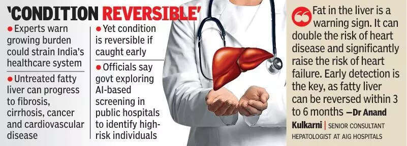 The study, led by the Council of Scientific and Industrial Research (CSIR), surveyed over 10,000 adults across 27 cities. In Hyderabad, nearly half of men (46%) and over a third of women (36.2%) were found to have fatty liver disease. Doctors attribute the surge to sedentary lifestyles, irregular eating patterns, processed food consumption and rising metabolic disorders — patterns closely associated with urban living. Delhi tops the chartsAmong major metros, Delhi recorded the highest prevalence at 41.3%, followed by Chennai at 41.2%. Bengaluru reported 40.6%, placing Hyderabad among the most affected large cities. Obesity emerged as the strongest risk factor. People with class-2 obesity had nearly 14 times higher risk of developing MASLD compared to those of normal weight. Diabetes doubled the risk, while hypertension and abnormal cholesterol further increased vulnerability. Doctors also warn of ‘lean fatty liver,’ where individuals with normal body weight develop the disease due to hidden metabolic risks such as diabetes or excess abdominal fat, challenging the belief that only overweight people are affected. A 2025 survey by the Asian Institute of Gastroenterology highlights the scale of the problem. It found fatty liver disease in over 25% of urban residents and about 20% in rural populations, with prevalence among IT employees — characterised by prolonged sitting and high stress — soaring to 84%. Sedentary lifestylesCity specialists say the fallout is already visible in oncology wards. Cases of hepatocellular carcinoma (HCC), the most common primary liver cancer, are rising sharply, with weekly diagnoses nearly doubling in recent years. “HCC is caused by cirrhosis (scarring of the liver), alcohol abuse, viral infections like hepatitis B and C, and increasingly by fatty liver diseases linked to obesity and diabetes,” said Dr Mukta Srinivasulu, former director of MNJ Cancer Hospital. “The obesity epidemic, sedentary lifestyle and poor diet are now major contributors,” he said.Dr Anand Kulkarni, senior consultant hepatologist at AIG Hospitals, noted a shift in disease patterns. “We are seeing that nearly 40–50% of our liver cancer patients are relatively young. Many come late, often with large tumours and sudden severe abdominal pain. Diabetes is a common underlying factor. MASLD, obesity and diabetes are closely linked, while alcohol remains another significant cause,” he said, adding that fatty liver has overtaken viral hepatitis as a major driver of serious liver complications. Condition is reversibleExperts warn the growing burden could strain India’s healthcare system. Untreated fatty liver can progress to fibrosis, cirrhosis, cancer and cardiovascular disease. Yet the condition is reversible if caught early. “Fat in the liver is a warning sign. It can double the risk of heart disease and significantly raise the risk of heart failure. Early detection is the key, as fatty liver can be reversed within 3 to 6 months. Even early fibrosis can improve within 8 to 10 months with proper treatment and lifestyle changes,” Dr Kulkarni said. Health officials say the govt is now exploring artificial intelligence-based screening in public hospitals to identify high-risk individuals earlier. Public health threat“It is being discussed to deploy AI-enabled screening tools in public healthcare institutions that can quickly analyse routine health data to identify people at high risk of fatty liver, so they can be referred for further evaluation and care, making screening more accessible, affordable and scalable alongside other non-communicable disease interventions,” an official said. The message from doctors is clear: Fatty liver is no longer a silent, harmless condition but a fast-growing public health threat rooted in everyday lifestyle choices.