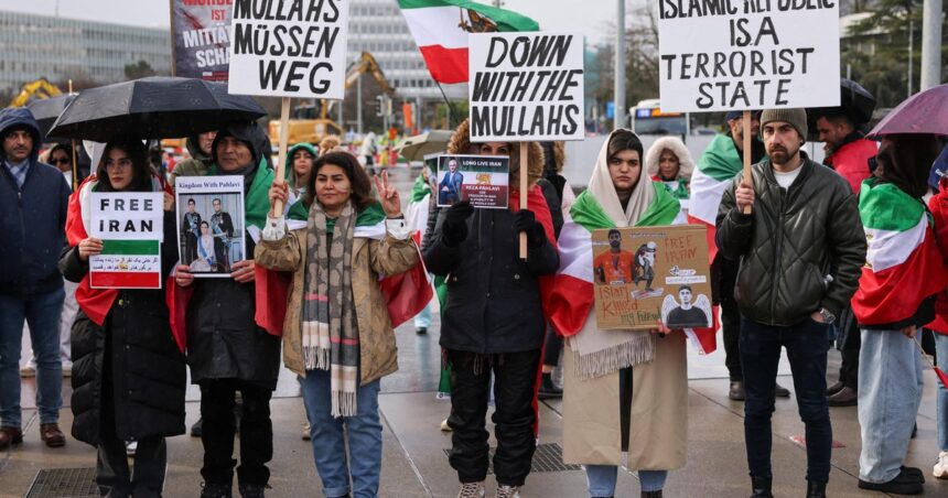 People carry placards at a protest near the United Nations office, as the second round of nuclear talks between U.S. and Iran takes place, in Geneva, Switzerland, Feb. 17, 2026.