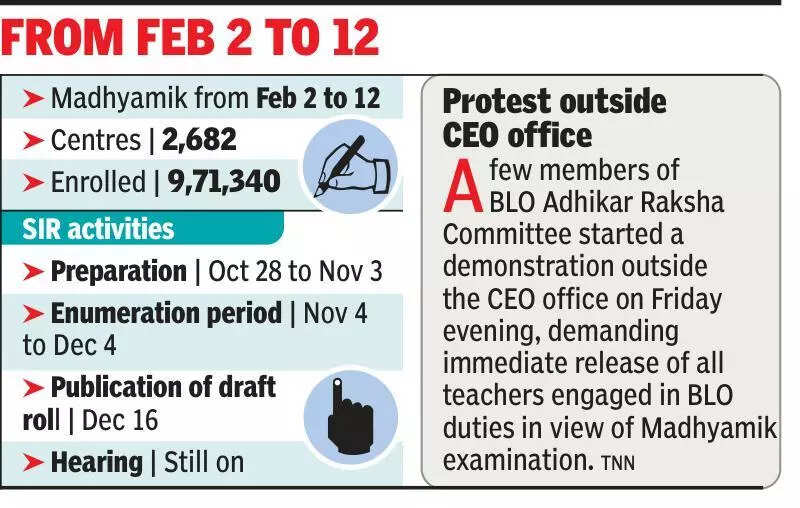 Kolkata: With Madhyamik examination set to begin in two days, the West Bengal Board of Secondary Education (WBBSE) is unaware of how many teachers and education dept officers are performing SIR duties. On Jan 27, the board sent letters to the CEO of the Election Commission and the district administration requesting the release of BLOs. However, according to board president Ramanuj Ganguly, no satisfactory response was received.However, as an alternative arrangement, teachers from neighbouring schools were deployed as required. School inspectors are usually assigned as officers-in-charge. A board official said where SIs were still performing as AEROs for SIR, they were replaced by other officials in DI offices across districts, or, in some cases, officers from the BDOs were assigned as an alternative arrangement.The board president also recently wrote to the district magistrates, requesting necessary adjustments in the electoral duty roster from Feb 2 to Feb 12, especially for those assigned as centre officers-in-charge, additional venue supervisors, and invigilators.Explaining duties of teachers and officers during a press conference on Friday, Ganguly highlighted that the officer-in-charge plays a major role, as they are authorised to collect confidential materials from custodians before the exam begins, and their signatures are mandatory on answer-sheet packets after each exam.He said, “The letter clearly mentioned how important the role played by teachers and officers is in conducting the exam smoothly. We requested them to spare teachers and officers during exam days as we need their full-day participation and are bound to maintain confidentiality of the entire process.” The examination requires around 1 lakh invigilators, who are teachers from schools across the state.He claimed that requisition for BLO appointments was made without informing the board. “In a recent HC order, the court clearly stated in paragraph 14 that teachers should perform BLO duties on non-working days and not on school days, ensuring that the education system is not disrupted. So, we are hopeful that, considering the gravity of Madhyamik, the commission will do the needful.”He also requested alternative arrangements or temporary relief for these personnel during the examination days so that the exams are not disrupted.This year, 9,71,340 candidates have enrolled for Madhyamik. The number of enrolled candidates increased slightly from last year’s 9,69,425.