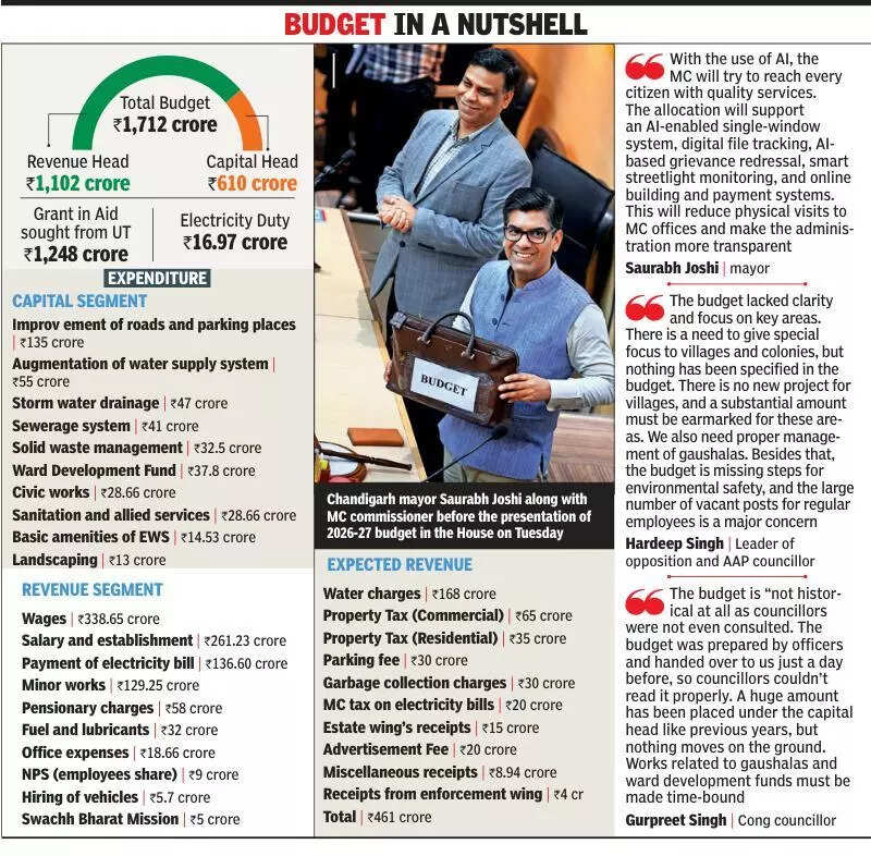 Chandigarh: Bringing a tech-forward twist to civic governance, the Chandigarh municipal corporation has set aside a dedicated Rs 12 crore fund to infuse Artificial Intelligence into day-to-day operations—from tracking employee output to monitoring service delivery right at residents’ doorsteps. The allocation comes as part of the MC’s Rs 1,712-crore budget for 2026-27, even as the civic body stares at a Rs 93.75-crore deficit.AI emerged as the star of this year’s budget discussion, which also focused on improving gaushala management, strengthening water and sewerage systems, and boosting support for EWS societies and villages.Giving top priority to integrating AI and technology into the functioning of the Municipal Corporation Chandigarh, mayor Saurabh Joshi said in his budget speech that the civic body aims to take services directly to citizens’ doorsteps. “With the use of AI, the MC will try to reach every citizen with quality services. Taking forward the Digital India vision, a provision of Rs 12 crore has been made for AI and IT upgrades for the first time,” he said. The allocation will support an AI-enabled single-window system, digital file tracking, AI-based grievance redressal, smart streetlight monitoring, and online building and payment systems. “This will reduce physical visits to MC offices and make the administration more transparent,” Joshi added.Expanding on the digital roadmap, municipal commissioner Amit Kumar said AI-backed smart paid parking, time-based monitoring of door-to-door garbage vehicles, and real-time oversight of water and sewerage systems will be part of the initiative. He said the Integrated Command and Control Centre (ICCC) will be strengthened and that the administration is consulting multiple experts, though decisions will be taken only after detailed assessment.During the budget discussion, opposition councillors strongly flagged gaps in gaushala management and water and sewerage services, and demanded greater attention to EWS societies and villages—issues that dominated their interventions.Revenue generation also received significant emphasis. The MC announced a one-time settlement scheme for taxpayers with pending arrears, alongside measures such as digital tax collection, smart parking and a digital advertising policy. Revenue projects proposed under the PPP model, EV charging stations, mobile-tower rentals and a modern community centre were also part of the financial blueprint.Upgrading vending zones and building a model vending zone with essential facilities remained another key item. Councillors stressed that vendors are an important part of the urban economy and must be provided proper spaces. Officials said each vending zone will soon have three bins, and vendors will be required to maintain their own bins to ensure sanitation.Imp Box: AI in PrayagrajPrayagraj Municipal Corporation’s rapid AI adoption for monitoring cleanliness—especially around the Sangam—showed striking results. Using AI-powered cameras, PMC tracked garbage-bin fill levels, flagged illegal dumping, and identified waste types for better sorting. Door-to-door collection, sweeping and disposal functions were all integrated for real-time oversight.Box: Budget copies come too lateCouncillors across party lines objected to receiving the bulky budget document only a day before the meeting, saying they didn’t have enough time to study it. They urged the mayor to ensure timely distribution in future so members can offer informed suggestions.Box: GiA already pre-decidedWhile the MC passed a Rs 1,712-crore budget seeking Rs 1,248 crore in Grant-in-Aid, the UT administration had already announced Rs 850 crore for the civic body weeks earlier. Councillors said this makes the GiA request largely a formality, with key financial decisions already taken by the administration.Quotes:With the use of AI, the MC will try to reach every citizen with quality services. The allocation will support an AI-enabled single-window system, digital file tracking, AI-based grievance redressal, smart streetlight monitoring, and online building and payment systems. This will reduce physical visits to MC offices and make the administration more transparentSaurabh Joshi | mayor The budget lacked clarity and focus on key areas. There is a need to give special focus to villages and colonies, but nothing has been specified in the budget. There is no new project for villages, and a substantial amount must be earmarked for these areas. We also need proper management of gaushalas. Besides that, the budget is missing steps for environmental safety, and the large number of vacant posts for regular employees is a major concernLeader of opposition and AAP councillor Hardeep Singh The budget is “not historical at all as councillors were not even consulted. The budget was prepared by officers and handed over to us just a day before, so councillors couldn’t read it properly. A huge amount has been placed under the capital head like previous years, but nothing moves on the ground. Works related to gaushalas and ward development funds must be made time-bound.Gurpreet Singh | Congress councillor The budget is aimed at the city’s holistic development. The works under the ward development fund need to be expedited, and with the increased allocation, the amount must be carried forward. The MC should hire EVs on rent instead of petrol and diesel vehicles, and all pending fire vehicles should be purchased at the earliest.BJP councillor Maheshinder Singh SidhuBudget figures:Total Budget 1,712 crore Capital Head 610 crore Revenue Head 1,102 crore Grant in Aid sought from UT 1,248 crore Electricity Duty 16.97 crore Box: Key heads under capital segment kept amount against them Heads———————————————————————Amounts1: Improvement of roads and parking places———————135 crore 2: Augmentation of water supply system—————————55 crore 3: 