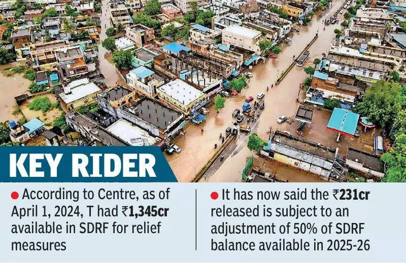 Hyderabad: Months after devastating floods battered parts of Telangana during the 2025 monsoon, the state is still waiting for central flood relief assistance, with the crucial post-disaster needs assessment (PDNA) report yet to be finalised by the Centre.The delay has stalled the release of additional funds even as the state continues to count heavy losses, particularly in Kamareddy and Hanumakonda districts. The state govt had initially estimated flood losses at ₹5,000 crore, while the Centre has only recently completed its assessment process. Official sources said the assessment was carried out by a team from the National Disaster Management Authority (NDMA) along with experts from various govt of India departments, who visited Telangana in the third week of Jan to finalise their evaluation. “The assessment was done by a team of subject experts sent by NDMA and GoI. The report for 2025 is being prepared as the inter-ministerial central team (IMCT) visited Warangal and Hanumakonda on Jan 16. It will be drafted based on their comments,” a senior state govt official told TOI.The official said the state had submitted damage estimates for both 2024 and 2025, and pointed out that the IMCT visited Telangana once in 2024 and twice in 2025. “The GoI had asked for a PDNA report, and the same was sent for 2024 for an amount of ₹3,011 crore recently,” he said. T put loss at ₹10,300 crWhile the Union home ministry initially released ₹231 crore as additional assistance under the National Disaster Response Fund (NDRF), the Telangana govt assessed total damage to various departments and properties at ₹10,300 crore.In Feb last year, a high-level committee, chaired by Union home minister Amit Shah, approved ₹1,554 crore as additional central assistance to five states, including Telangana, that were affected by floods, flash floods, landslides and cyclonic storms in 2024. However, the release of this assistance is subject to an adjustment of 50% of the opening balance available in the State Disaster Response Fund (SDRF) for the year. “This additional assistance is over and above the funds released by the Centre to the states in the SDRF, which is already placed at the disposal of the states. During the 2024-25 fiscal, the Centre released ₹18,322 crore to 27 states under SDRF, ₹4,808 crore from NDRF to 18 states, ₹2,208 crore from the State Disaster Mitigation Fund to 14 states, and ₹719 crore from the National Disaster Mitigation Fund to eight states,” the Centre said. Utilisation certs soughtState govt officials, however, said the assistance received was inadequate. They pointed out that Telangana had also sought ₹5,400 crore as immediate relief, which was not granted. Officials recalled that when the state sought financial assistance soon after heavy rains caused widespread damage, the Centre asked it to furnish details of SDRF utilisation for funds released earlier. According to the Centre, as of April 1, 2024, Telangana had ₹1,345 crore available in the SDRF for relief measures during natural calamities. It has now stated that the ₹231 crore released is subject to an adjustment of 50% of the SDRF balance available in 2025-26.