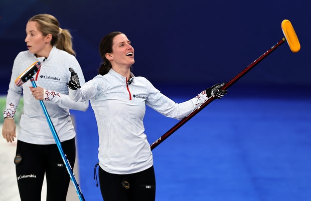 Tara Peterson of the U.S. Olympic curling team celebrates as she competes during a match at the Milano Cortina 2026 Winter Olympic Games on Feb. 19, 2026, in Cortina d’Ampezzo, Italy.
