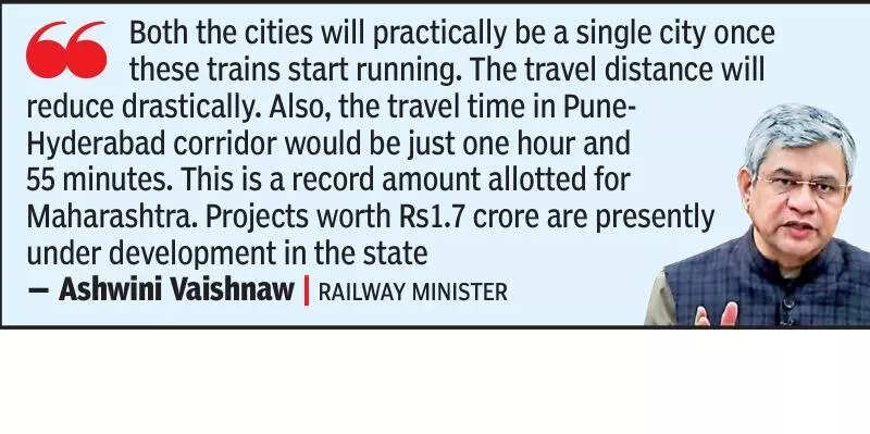 Pune: Railway minister Ashwini Vaishnaw on Monday said commuters would be able to travel between Pune and Mumbai within 48 minutes once the high-speed rail corridor between the two cities was ready.Calling it a Bullet Train project, the minister said, “Both the cities will practically be a single city once these trains start running. The travel distance will reduce drastically. Also, the travel time in Pune-Hyderabad corridor would be just one hour and 55 minutes,” Vaishnaw said during a media interaction over video from Delhi.At present, trains take around three to four hours to travel between Pune and Mumbai. The cities are located around 191km apart.The railway minister did not mention any timeline related to the high-speed rail corrdor project, but said a total sum of Rs23,926 crore was allotted in the Budget for rail projects in Maharashtra. “This is a record amount allotted for Maharashtra. Projects worth Rs1.7 crore are presently under development in the state,” he said, adding that the tracks along the corridor would be designed to make modern trains run at a maximum speed of 350kmph.Vaishnaw said, “Both Pune and Hyderabad are major IT hubs. Both the cities will connect faster through the new corridor.”He said, “The new dedicated freight corridor will also benefit Maharashtra, as it will connect to the Vadhavan port. The corridor will start from Dankuni in Bengal, pass through Odisha, Chhattisgarh, Madhya Pradesh and Maharashtra before entering Surat in Gujarat, and connecting to the western freight corridor. The Vadhavan port, poised to be a major port in the near future, will get connected to different hinterlands thus.” Commuters stressed the railway ministry should announce more details about the high-speed rail corridor project. “We need to know when one can expect the project to be on the ground and start. This project is a game changer but should not be one of those delayed by years. Travelling between Pune and Mumbai and back has become a major problem via any means these days. The railway should immediately share more intricate details about the project,” Prasun Jogi, a regular commuter between the two cities, said, adding that the railway also needed to quickly announce the stops and estimated fares.An official of the Pune rail division said a total of 132 stations in the state had been identified for redevelopment under the Amrit Bharat Scheme. “Of these, 17 are ready,” he said.