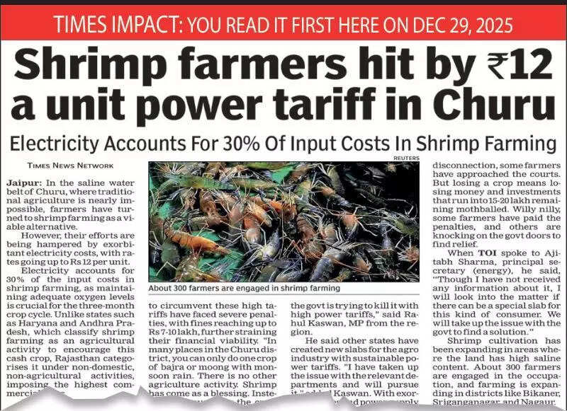 Jaipur: Shrimp farmers in Rajasthan, facing high electricity tariffs, may get relief after finance minister Diya Kumari announced in the State Budget that power rates will be reduced to spur the rural economic activity.Energy department sources said the govt is considering a separate tariff slab for shrimp farming, likely positioned between industrial and agricultural categories. The issue gained attention after TOI highlighted the farmers’ concerns with a news report titled “Shrimp farmers hit by ₹12 a unit power tariff in Churu” in its Dec 29 Jaipur edition.In the saline water belt of Churu, where traditional agriculture is nearly impossible, farmers turned to shrimp farming as a viable alternative. Their efforts, however, are being hampered by exorbitant electricity costs, with rates going up to Rs 13 per unit.“We are looking to create a new slab for this farming activity. Decision on tariff levels will be taken after studying models in other states and factoring in local conditions,” said a senior energy department official.Electricity accounts for 30% of the input costs in shrimp farming, as maintaining adequate oxygen levels in the ponds for the 3-month crop cycle is crucial for the survival of shrimps.Unlike states such as Haryana and Andhra Pradesh, which classify shrimp farming as an agricultural activity to encourage this cash crop, Rajasthan categorises it under non-domestic, non-agricultural activities, imposing the highest commercial rates.While attempting to circumvent these high tariffs, some farmers faced severe penalties, with fines reaching up to Rs 7-10 lakh, straining their financial viability.“In many areas of Churu district, you can only do one crop of bajra or moong with monsoon rain. There is no other agriculture activity. Shrimp came as a blessing. The govt should encourage the crop, and low power tariffs are critical for it,” said Ravi Kant, a shrimp farmer in Ratangarh.Shrimp cultivation has been expanding in areas where the land has high saline content. About 300 farmers are engaged in the occupation. In recent years, farming is expanding in other districts like Bikaner, Sriganganagar, and Nagaur.