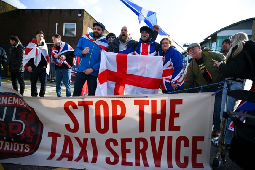 A group calling themselves the Poole Patriots and Bournemouth Patriots staged a protest outside the Poole RNLI, calling for it to “stop the taxi service”.