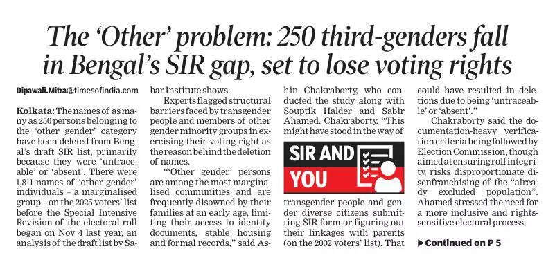 Kolkata: Alarmed at how the ongoing SIR failed to safeguard the constitutional right of trans and queer persons to vote, members of the trans and queer communities launched an online signature campaign to stop disenfranchising trans-queer voters in Bengal.TOI reported that the names of as many as 250 persons, from among 1,811, belonging to the ‘other gender’ category were deleted from Bengal’s draft SIR list, primarily due to being ‘untraceable’ or ‘absent’.
