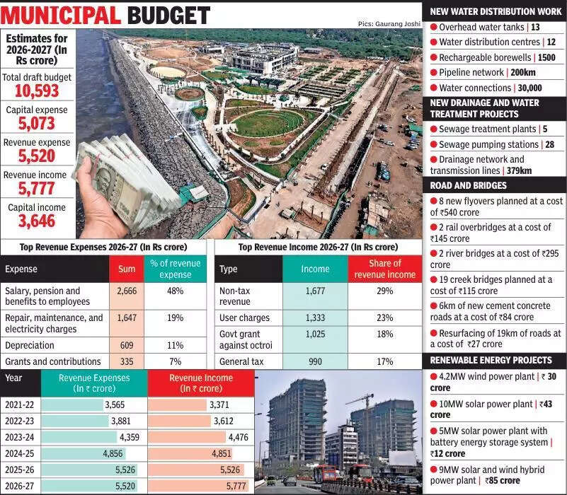 “It is a Rs 257 crore revenue surplus budget. The projects planned are a step further towards make Surat a world-class city,” Nagrajan added.Among the major projects in the city are the riverfront development, Rundh Bhatha barrage, river embankment, the Dumas seaface project and SMC’s new administrative building.Phase 1 of the riverfront project includes construction of embankments along both banks of the Tapi from the Rundh-Bhatha barrage to Kathor Bridge, spanning 33km, and development of amenities along an approximately 10-km stretch from the barrage to Singanpore Weir. In Phase 2, amenities will be developed along a 23-km stretch from the weir-cum-causeway to Kathor Bridge.On the left bank of the Tapi, from the barrage to Sardar Bridge, riverfront development work will be taken along 4,800m and stormwater drain interceptor works for about 5,826m.For the Rundh-Bhatha barrage, clearances were obtained from various departments. The coffer dam design was approved by the Central Water Commission and work will begin shortly. The barrage design proof-checking by CWC is in progress. As part of the package, work on the near Rahulraj Mall is in progress. In the current financial year 2025-26, Rs 150 crore will be spent on this project.In the Dumas seaface project, Zone 1 covering 10.32 hectares has infrastructure being developed at a cost of Rs 174 crore, and 82% of the work is complete. In Zone 2, covering 2.54 hectares, infrastructure is being developed at a cost of Rs 83.44 crore with 45% of the work being completed.