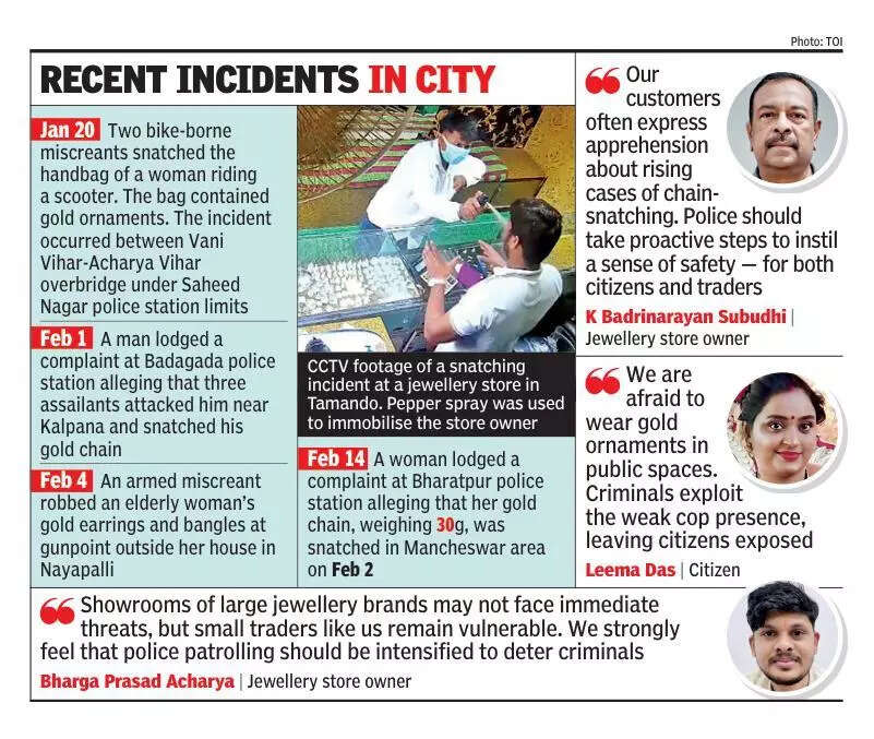 Bhubaneswar: Snatchers struck twice in the city on Tuesday, decamping with gold ornaments worth lakhs from an elderly woman and a jewellery store within a few hours of each other, leaving residents shaken and police searching for clues.In the first incident, septuagenarian Sakuntala Mohanty, mother of a police officer, was targeted during her morning walk in Sailashree Vihar. Around 9 am, two bike-borne miscreants wearing masks slowed the vehicle near her and snatched her gold chain worth nearly Rs 3 lakh. Mohanty, still trembling from the snatching, recounted how she raised an alarm but found herself alone on a desolate street. “I am feeling very unsafe. I never imagined that I would be a victim of snatching,” the 76-year-old woman said, describing the fear after the sudden attack. The crime came close on the heels of another snatching inicident in Nayapalli on Feb 4, where an armed miscreant robbed an elderly woman of her earrings and bangles at gunpoint.Barely hours after Mohanty’s ordeal, another brazen robbery unfolded in Kalinga Vihar under Tamando police station limits. A masked man entered a jewellery store around 1 pm, posing as a customer looking for ornaments for his sister’s wedding. As store owner Bijay Barik calculated the price of a gold chain and rings, the miscreant sprayed pepper in his eyes and fled with jewellery worth over Rs 6 lakh. CCTV footage captured the sequence, showing the criminal’s calculated deception before a swift escape. “He asked for ornaments, and when I was busy with the bill, he attacked me and ran away,” Barik said, still shaken by the incident.The twin snatching incidents have sparked safety concerns in the city, especially during the ongoing assembly session. Investigators have begun examining CCTV footage from both localities to trace the culprits. Senior police officers suspect the involvement of separate gangs, given the different modus operandi. “We are analysing the crime pattern and looking for leads,” a senior police officer stated.
