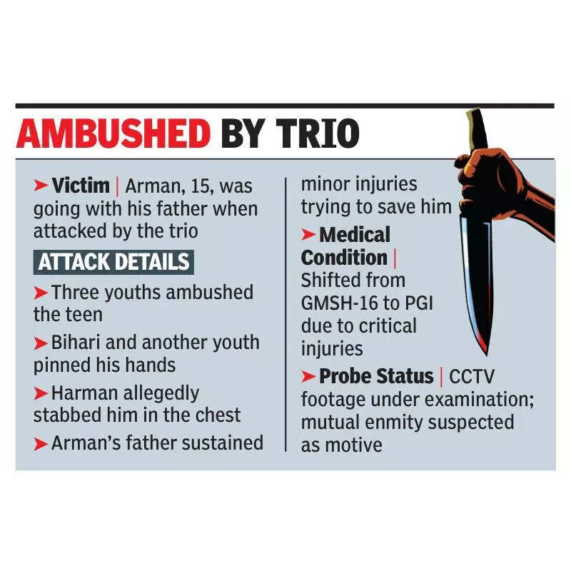 Chandigarh: Two separate stabbing incidents left a 15-year-old Dadumajra boy in critical condition and another man injured in Mauli Jagran, prompting police to launch parallel investigations.In the first case, a teenager, Arman, was injured after three youths attacked him with a knife at Dadumajra colony late on Wednesday night. The crime occurred in front of the victim’s father, who sustained minor injuries while trying to save the teenager. The injured boy was first taken to GMSH-16. After primary treatment, doctors referred him to PGI due to his critical condition.In a complaint to police, Sanjay, 40, a resident of Dadumajra colony, Sector 38, said around 9.30pm on Feb 11, he was going towards Ramlila ground with his son Arman when Harman, Bihari and another youth arrived at the site and attacked Arman. Bihari and his companion held both of Arman’s hands, while Harman allegedly stabbed in his chest with a knife. Arman fell down on the road in a pool of blood. After the incident, all three accused fled the spot. Bihari is a relative of Sanjay.When Sanjay raised an alarm, nearby people reached the spot and helped take the injured to GMSH-16. Later, they informed the police about the incident. Maloya police registered a case of attempted murder against Harman, Bihari and another accused under sections of the Bharatiya Nyaya Sanhita (BNS). Maloya police station police were examining CCTV footage around the incident site to gather more clues on the suspects.In the preliminary investigation, mutual enmity was being considered as the possible reason for the attack.In a separate case, Mauli Jagran police booked two people for allegedly stabbing a person with sharp-edged weapons. The injured person was admitted to GMSH-16. No arrest was made in the case so far. The injured was identified as Abhishek of Mauli Jagran Complex, Chandigarh. Abhishek alleged that Vicky, David and others attacked him with sharp weapons at Mauli Jagran.