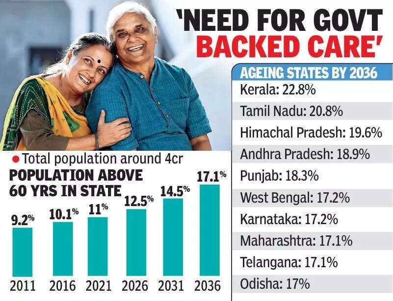 Hyderabad: As Telangana braces for a sharp rise in its elderly population, the state is beginning to rework its healthcare priorities to meet the demands of an ageing society. Senior citizens aged above 60 years are projected to form 17% of the state’s nearly four crore population—around 68 lakh people—by 2036, according to the Reserve Bank of India’s (RBI) report, ‘State Finances: A Study of Budgets 2025-26′.This represents an increase of nearly 20 lakh elderly persons over the next decade. Currently, senior citizens account for about 12% of Telangana’s population, or roughly 48 lakh people. This share is expected to rise to 14.5% by 2031, up from the present 12.5%, underscoring the growing urgency for expanded and specialised healthcare services for the elderly.State ranks 7thAmong the 12 major states identified in the RBI report as having ageing populations, Telangana jointly ranks seventh with Maharashtra, with 17.1% of its population expected to be above 60 years by 2036. Kerala tops the list at 22.8%, followed by Tamil Nadu (20.8%), Himachal Pradesh (19.6%), Andhra Pradesh (18.9%), and Punjab (18.3%). At the national level, India’s elderly population is projected to reach 14.9% by 2036. Despite the steady rise in numbers, geriatric healthcare infrastructure in the state remains limited, with only one dedicated centre operating at Nizam’s Institute of Medical Sciences in Hyderabad. To bridge this gap, the state govt is planning to establish geriatric care centres in all 33 districts, attached to govt medical colleges.NIMS as key centreA Narendra Kumar, director of medical education, said the proposed centres will be coordinated by NIMS, which will serve as the centre of excellence. “These centres will function under general medicine departments and offer integrated services, including physiotherapy, nutrition, mental health counselling, and specialty referrals. Nodal officers have begun groundwork, and the initiative is expected to be operational by the end of the year,” he told TOI. In parallel, district medical and health officers have been tasked with preparing lists of elderly persons suffering from various health conditions. The initiative aims to address the rising burden of non-communicable diseases among senior citizens, including hypertension, diabetes, cancer, cardiac ailments, and kidney diseases. To strengthen manpower for elderly care, the state also plans to introduce geriatric medicine as a specialty course in all 35 medical colleges across Telangana. At present, specialised geriatric training is offered only at Gandhi Medical College, highlighting a significant shortage of trained geriatricians. The state govt has also partnered with Tata Trusts to implement the ‘elder spring response’ system, aimed at creating a holistic support network for senior citizens.Mental health concernsDr K Sunil Kumar, head of the general medicine department at Gandhi Hospital, pointed to a marked shift in the health profile of the elderly. “While earlier, communicable diseases were more common, now non-communicable and lifestyle diseases are increasing. Mental health concerns among the elderly have emerged as a growing need, prompting the govt to include psychosocial support in its geriatric framework,” he said.