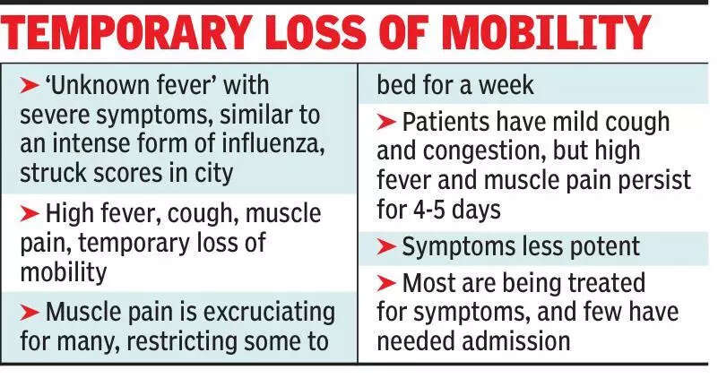 Kolkata: Close on the heels of Nipah and multiple other viruses, an unidentified virus with severe symptoms, similar to an intense form of influenza, struck scores in Kolkata. It struck with high fever, cough and muscle pain, leading to temporary loss of mobility. The muscle pain was excruciating for many, restricting some patients to bed for a week.While respiratory illnesses started waning, the ‘unknown’ or viral fever has now taken over, said Charnock Hospital pulmonology head Soumya Sengupta. “These patients have mild cough and congestion, but high fever and muscle pain persisting for 4–5 days. Most are being treated for symptoms, and few have needed admission or oxygen support so far,” said Sengupta. He added that the fever was triggered by temperature fluctuations and was likely to continue till the mercury ‘settled’.BP Poddar Hospital received 26 patients with fever of ‘unidentifiable origin’. “We are seeing patients with moderate-grade fever where no clear source is identifiable. Many do not have prominent symptoms, while some present mild upper respiratory issues like sore throat or runny nose, suggestive of a primary viral illness. Others report only weakness, body ache and malaise. To rule out any underlying infection, we are advising Complete Blood Count, Erythrocyte Sedimentation Rate and C-Reactive Protein,” said Rajdip Sen, consultant physician, BP Poddar Hospital.Most fevers remain undetected since ‘biofire panel’ tests are rarely done. However, the symptoms keep varying every year, due to mutations of the viral strain, said Manipal Hospital infectious diseases physician Sayan Chakrabarty. He added, “Most patients have fever and body ache as the principal symptoms, though cough and congestion continue to affect many. The positive sign is that while so far we were receiving patients with severe bacterial pneumonia or infections that could lead to it, the number dropped. Now, we have more with fever of unknown origin that can be treated with medicines.” An unknown fever is affecting many, presenting with high temperature, cough, body aches, and in severe cases, respiratory distress, said Sarbajit Ray, consultant physician, ILS Hospitals, Salt Lake. “It is mostly viral in origin and has led to increased illness among the elderly and individuals with pre-existing lung or heart conditions. Vaccination against influenza and pneumonia is strongly advised for elderly and chronically ill people.“MS Purkait, medical superintendent of Techno DAMA Hospital, said, “Change of season viruses like RSV, influenza viruses, rhinovirus and human metapneumovirus are common now, and symptoms are similar to that of dengue and chikungunya. There could be high temperature with body ache, runny nose, sneezing and red eye.”“Three patients have been admitted for observation and supportive care, while two are under home care but remain under medical monitoring. We urge people to avoid self-medication and seek timely medical attention if fever persists,” said Supriyo Chakrabarty, BP Poddar group advisor.