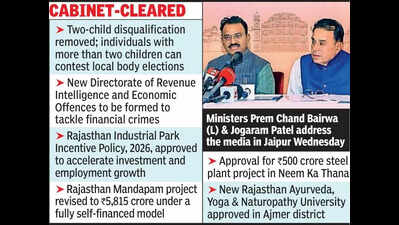 Jaipur: The Rajasthan Cabinet Wednesday approved key legislative amendments and policy decisions, including the removal of the norm that barred individuals with more than two children from contesting Panchayati Raj and urban local body elections.The Cabinet cleared the Rajasthan Panchayati Raj (Amendment) Bill, 2026, and the Rajasthan Municipalities (Amendment) Bill, 2026, which seek to modify section 19 of the Rajasthan Panchayati Raj Act, 1994, and section 24 of the Rajasthan Municipalities Act, 2009. The Bills are likely to be introduced in the state Assembly during the ongoing Budget session.“With this amendment, individuals with more than two children will now be eligible to contest Panchayati Raj and municipal elections,” state parliamentary affairs and law minister Jogaram Patel told reporters after the meeting. Patel said the two-child norm was introduced when population control was a pressing concern. “Between 1991 and 1994, the fertility rate was around 3.6. It has now declined to nearly 2. In the current scenario, the direct impact of such provisions is significantly reduced,” he said.Also speaking on the occasion, state industries and commerce minister Rajyavardhan Rathore said the change reflects shifting demographic and social conditions.The move is expected to widen the pool of prospective candidates in both rural and urban constituencies ahead of the local body elections due in March–April.In another major decision, the cabinet approved the formation of a new Directorate of Revenue Intelligence and Economic Offences to crack down on financial crimes, including illegal land encroachments and fraudulent documentation. Deputy chief minister Prem Chand Bairwa said the existing State Revenue Intelligence Directorate will be dissolved and replaced with the new body to ensure “better prevention of economic offences and improved financial discipline”.The directorate will target real estate fraud, financial crimes linked to banks, insurance companies, NBFCs and the stock market, multi-level marketing scams, fraudulent bankruptcy cases, fake placement agencies and forged documents used for jobs or admissions.Rathore also announced the Rajasthan Industrial Park Incentive Policy, 2026, aimed at boosting investment and employment. The policy mandates a minimum of 50 acres and at least 10 industrial units for private parks. “A 20% capital subsidy will be provided, capped atRs 20 crore for parks up to 100 acres, Rs 30 crore for 100–250 acres, and Rs 40 crore beyond 250 acres. Additionally, 50% reimbursement for CETP expenditure (up to Rs 12.5 crore) was approved,” said Rathore.The cabinet further cleared a Rs 500 crore steel plant project in Neem Ka Thana and approved a revised self-financed model for the Rs 5,815 crore Rajasthan Mandapam project in Jaipur. It also approved the draft Rajasthan Ayurveda, Yoga and Naturopathy University, Ajmer Bill, 2026, for the setting up of a new AYUSH-focused university to promote education, research and medical tourism.Rajasthan currently has only one Ayurveda university, in Jodhpur.