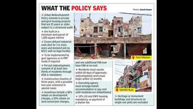Ghaziabad: UP govt on Feb 10 notified the Urban Redevelopment Policy, 2026, setting out, for the first time, a comprehensive framework to redevelop unsafe and dilapidated buildings that have contributed to “urban decay” and posed risks to residents across the state.Under the policy, both public and private housing projects that are at least 25 years old and span 1,500 square metres can be taken up for redevelopment, after a mandatory structural audit. Defunct industrial units that have remained shut for three years or more and have been declared sick by the National Company Law Tribunal, with no pending legal disputes, are also eligible.Govt agencies will be the primary implementing authorities, though projects may be executed under the public-private partnership (PPP) model where required. Officials said the policy addresses a long-standing regulatory vacuum that had stalled redevelopment efforts across cities.“In the absence of clear-cut guidelines for redeveloping dilapidated buildings, development authorities, private developers and apartment owners’ associations were often unsure of the process, leading to prolonged delays. These delays not only endanger lives but also run counter to sustainable urban development,” a senior GDA official said.The policy also seeks to respond to land scarcity and the growing demand for housing. By encouraging vertical redevelopment, officials believe underutilised land can be unlocked for additional residential units, including affordable housing. “Most ageing housing stock occupies large parcels of land. Redevelopment will allow more efficient use of space while adding much-needed affordable homes,” the official added.For private redevelopment projects, AOAs will be permitted to proceed only after obtaining the consent of at least two-thirds of residents. Construction timelines have been capped at three years, with a possible extension of up to two years in special circumstances.To incentivise participation, the policy offers a 50% rebate on development charges and a 25% rebate on land conversion charges. Developers will also be granted one additional floor area ratio (FAR) over and above the base FAR, free of cost. Additional FAR will allow them to add more floors or flats to recover redevelopment costs.The policy states the statutory formalities are to be completed within 60 days. Subsequently, residents of buildings identified for redevelopment will have to vacate the premises and construction must begin within 12 months of vacation. The executing agency has been made responsible for arranging transit accommodation, including paying rent, until residents are handed back their flats after redevelopment.The policy mandates that at least 10% of the redeveloped units be earmarked for economically weaker section (EWS) and lower-income group (LIG) housing. It, however, allows developers to pay a shelter fee in lieu of exemption. Declared monuments and heritage structures have been excluded from the policy’s ambit, as have buildings constructed on single-use plots.The urgency of such a policy is most evident in cities like Ghaziabad, which, according to a recent survey, has 150 buildings classified as “dangerous” and has witnessed multiple fatalities from collapses of ageing structures, even as redevelopment efforts continue to face persistent hurdles.Ghaziabad Development Authority has repeatedly faced resistance while attempting to redevelop older residential colonies, like Tulsi Niketan and Vaishali Apartment Scheme. Around 2,300 flats in Tulsi Niketan, built nearly four decades ago, were declared unfit for habitation in 2018 but residents opposed redevelopment without written assurances that they will be allotted new flats over the year. Their concerns were mostly rooted in ownership issues as nearly 90% of the residents in the colony hold their homes through power of attorney, while the Authority recognises ownership only when names appear on registered sale deeds. In Dec 2025, the NBCC was finally tasked with overseeing the colony’s redevelopment.In 2018, three 10-storey towers in Vaishali Apartment Scheme were declared unsafe and over 150 living in them told to vacate at the earliest. The redevelopment of the buildings, however, is still pending.Officials said that the new policy is expected to provide clarity, speed up stalled projects and reduce disputes, though its success will ultimately depend on implementation and the confidence it inspires among residents wary of past delays and broken assurances.