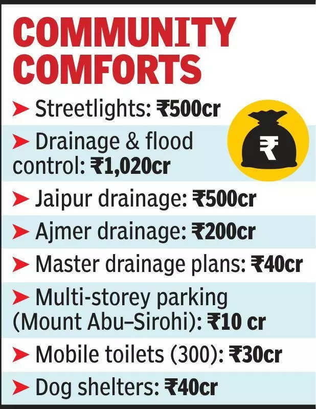 The state Budget outlined a series of allocations for urban local bodies, focusing on core civic infrastructure such as street lighting, drainage, flood control, parking, sanitation and digital service delivery. A major push was proposed for street lighting, with around 7 lakh energy-efficient streetlights to be installed across municipal areas. The project has been estimated to cost over Rs 500 crore and aimed to improve visibility, safety and energy savings in cities and towns.Drainage strengthening and flood mitigation formed another key segment of the budget. Jaipur was allocated Rs 500 crore and Ajmer Rs 200 crore to upgrade drainage networks. Separately, flood-control works worth Rs 1,020 crore were proposed for urban areas in Alwar, Bhiwadi, Udaipur, Kota, Churu, Pali, Nagaur and Bharatpur. To improve long-term stormwater planning, district-level urban local bodies will prepare master drainage plans, with Rs 40 crore earmarked for this exercise.Urban mobility measures included new parking infrastructure and technology-based management. A multi-storey parking facility for 200 vehicles will be built in the Mount Abu–Sirohi region at a cost of Rs 10 crore. Smart parking projects were also proposed for Jaipur, Kota, Bhilwada, Jodhpur and Ajmer to reduce congestion and improve parking operations. EV charging stations will be set up in phases at 100 major parking locations in municipal corporation areas through the PPP model.To strengthen civic service delivery, Smart Service Centres will be established in all urban local bodies in phases, offering online and time-bound services such as birth, death and marriage certificates, fire NOCs and other municipal permissions.Public convenience measures included 300 mobile toilets for urban local bodies at a cost of Rs 30 crore, facility centres for residents and tourists in Jaipur and Ajmer, dog shelters across municipal areas with an outlay of Rs 40 crore, and eco-cooling shelters at major public places for protection from heat and rain.