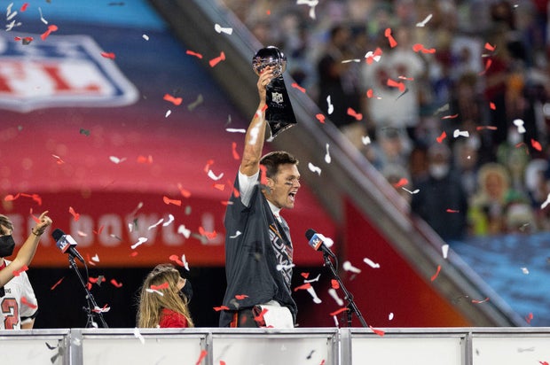 Tom Brady and his daughter Vivian celebrating during the award ceremony for Super Bowl LV at Raymond James Stadium on Feb. 7, 2021 in Tampa, Florida. The Tampa Bay Buccaneers defeated the Kansas City Chiefs 31-9.