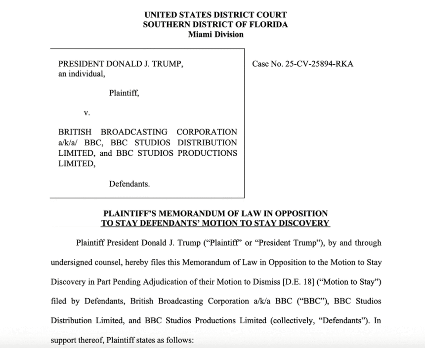 Trump’s lawyers say: “In an action displaying awareness of wrongdoing, Blue Ant pulled the documentary from its catalogue on or about November 12, 2025.”